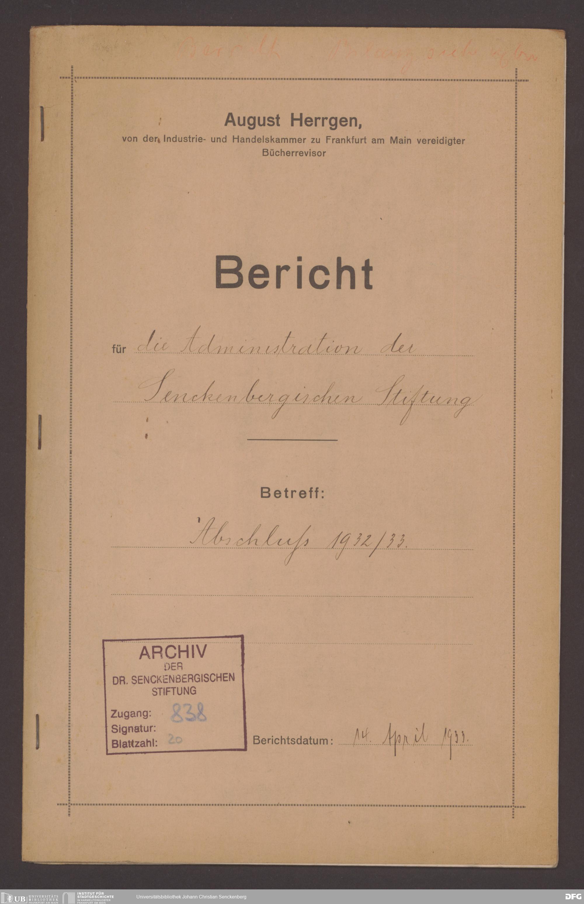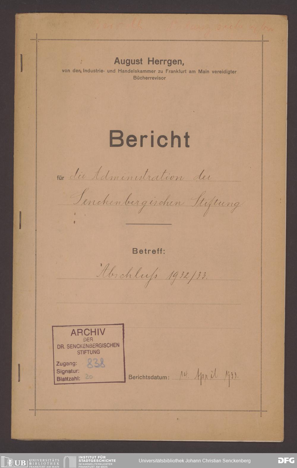 V48 Dr. Senckenbergische Stiftung, 838 - Bericht zum Jahresabschluss 1932/33 von August Herrgen