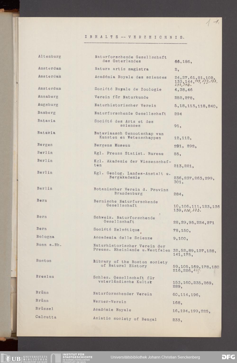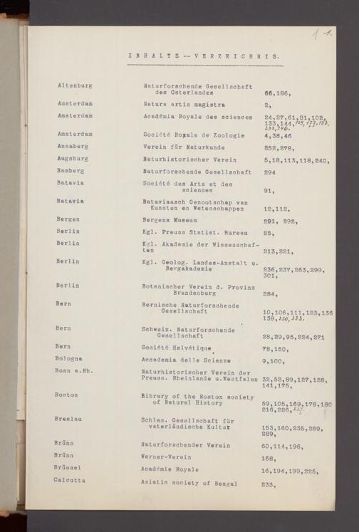 V176 Senckenberg Gesellschaft für Naturforschung, 17 - Korrespondenz über den Schriftentausch mit naturwissenschaftlichen Vereinigungen mit Ortsindex, Bd. 1