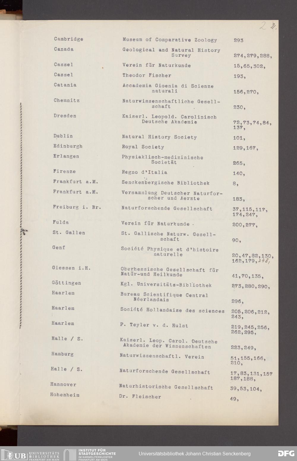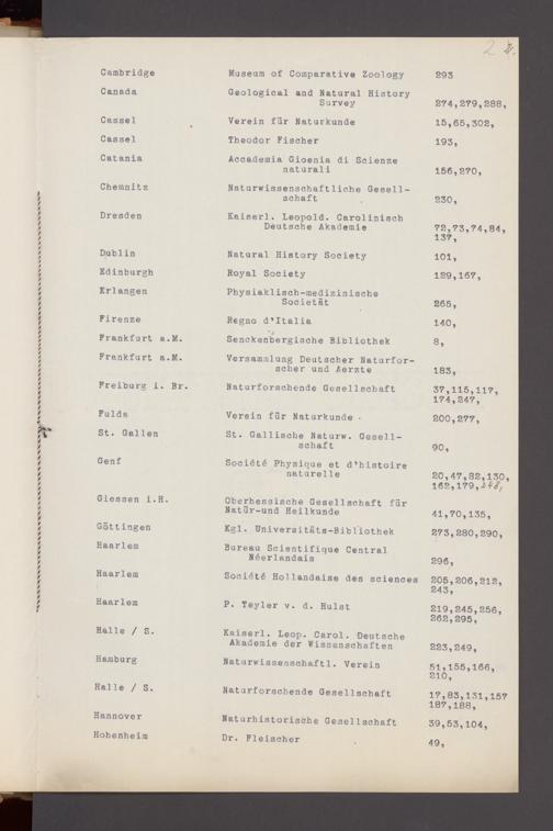 V176 Senckenberg Gesellschaft für Naturforschung, 17 - Korrespondenz über den Schriftentausch mit naturwissenschaftlichen Vereinigungen mit Ortsindex, Bd. 1