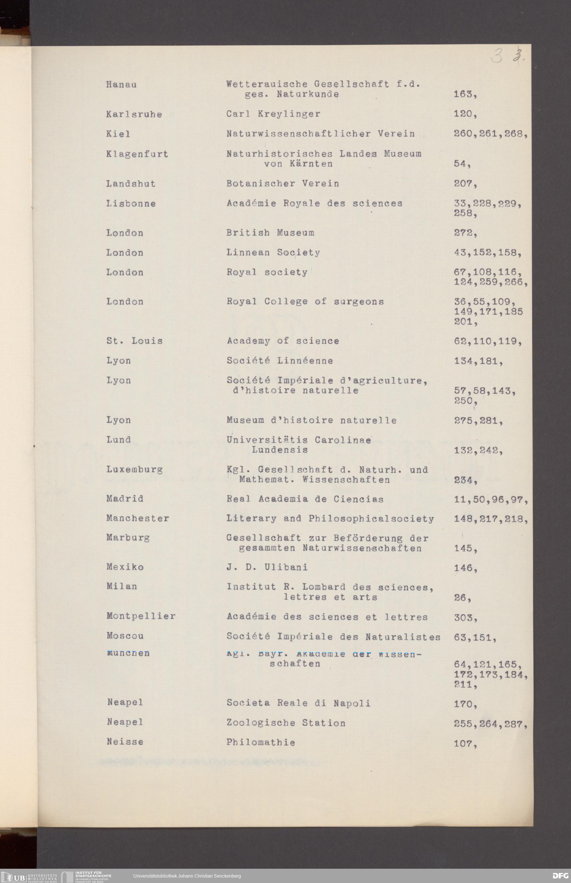 V176 Senckenberg Gesellschaft für Naturforschung, 17 - Korrespondenz über den Schriftentausch mit naturwissenschaftlichen Vereinigungen mit Ortsindex, Bd. 1