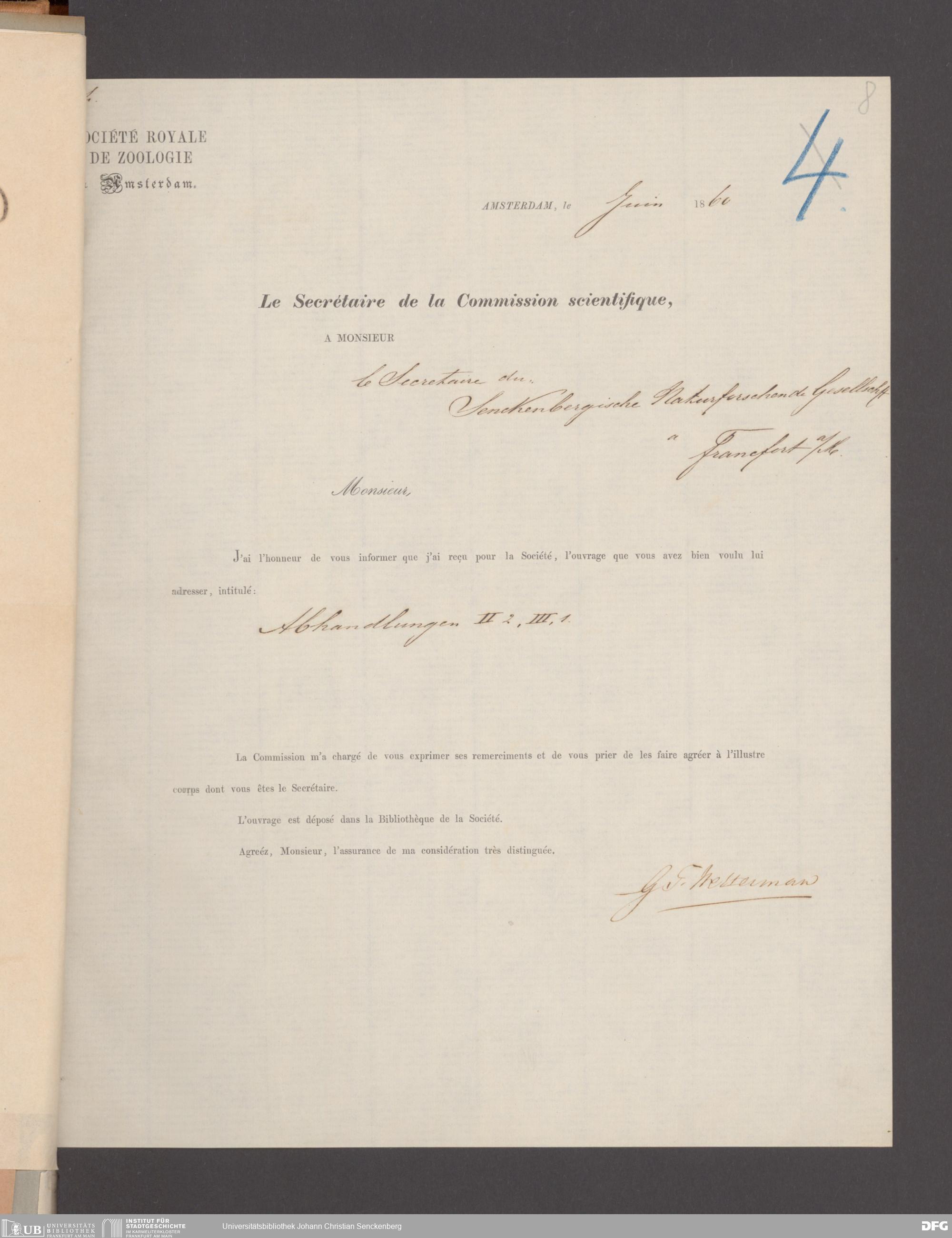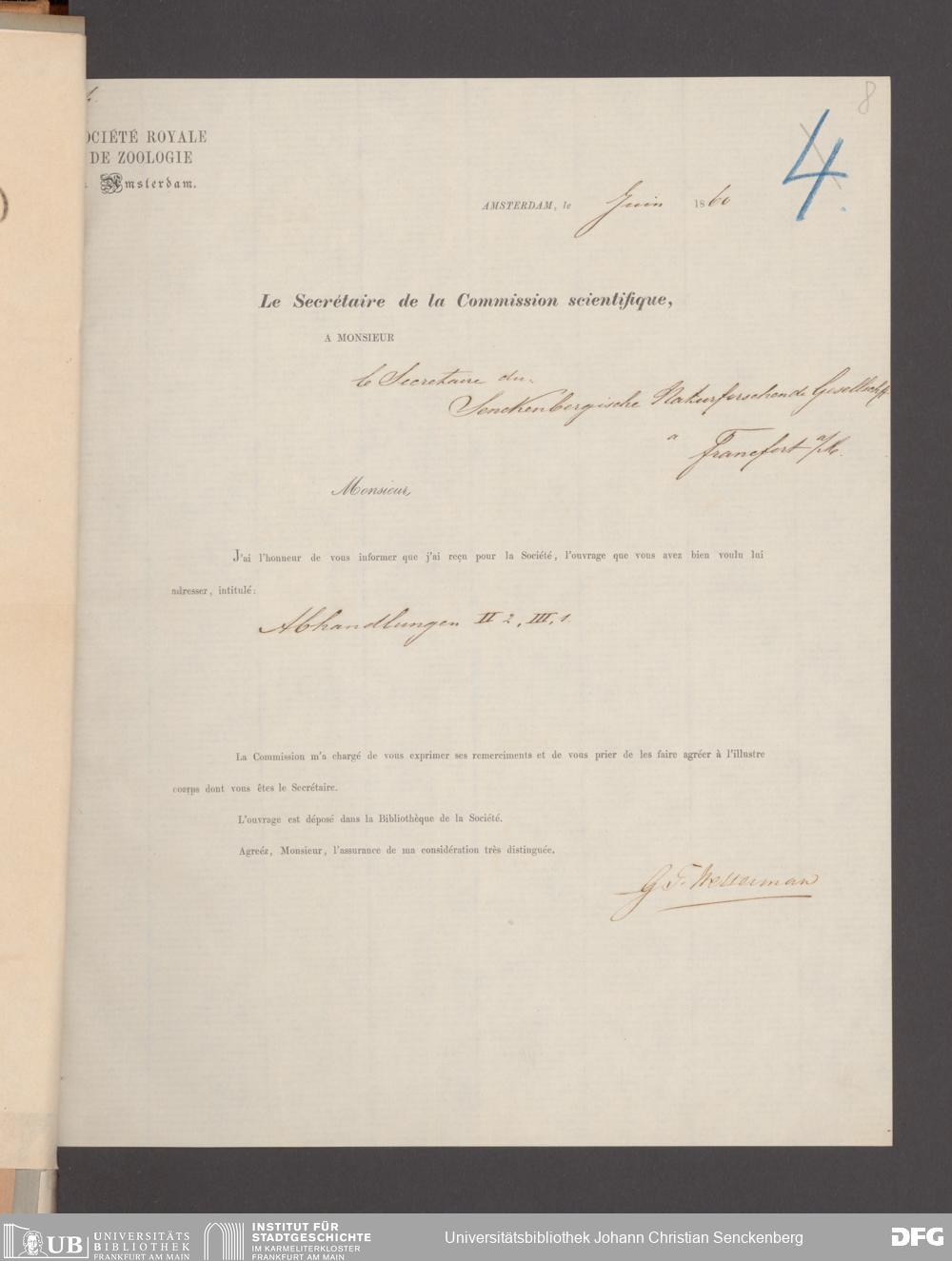 V176 Senckenberg Gesellschaft für Naturforschung, 17 - Korrespondenz über den Schriftentausch mit naturwissenschaftlichen Vereinigungen mit Ortsindex, Bd. 1