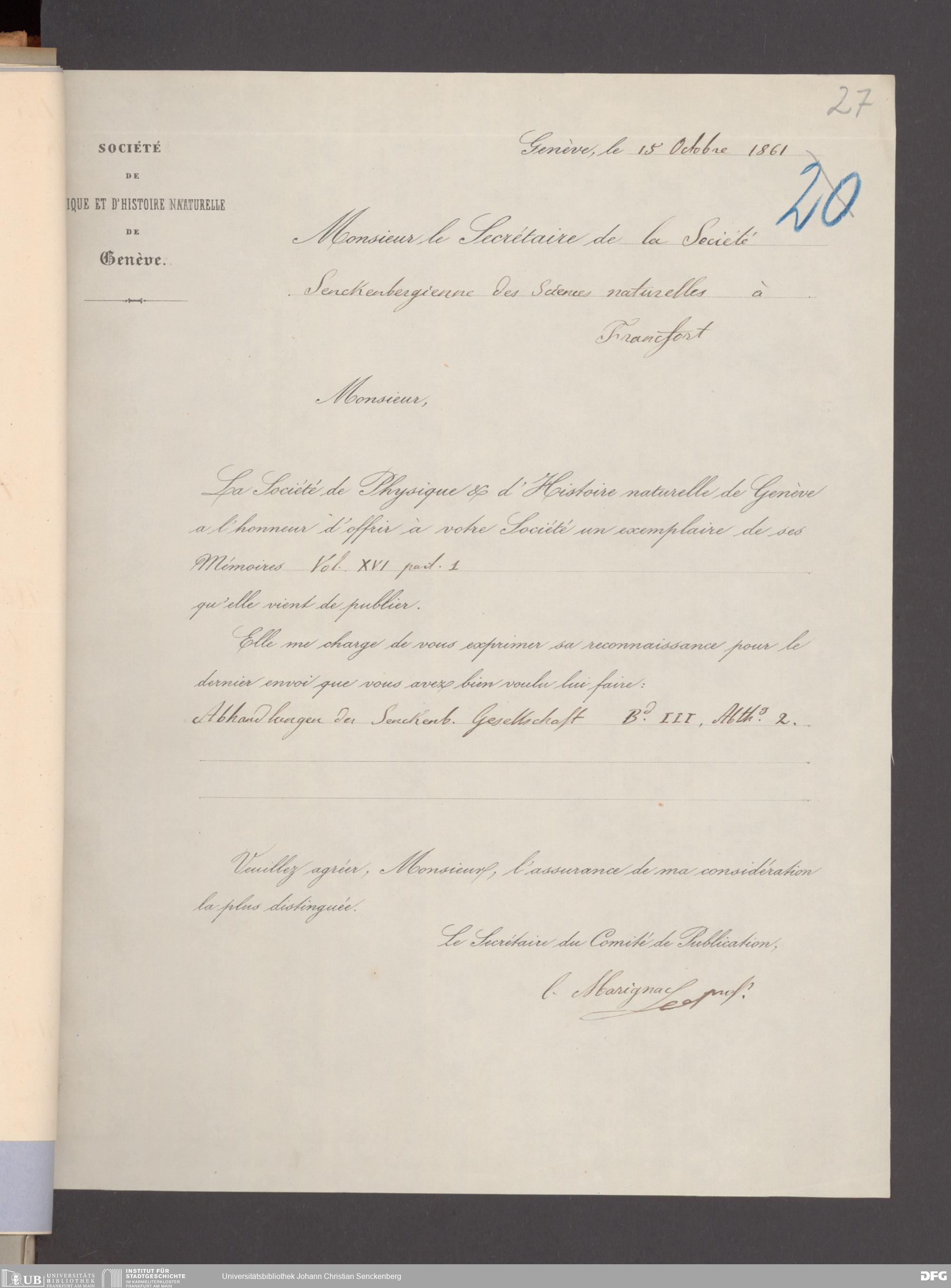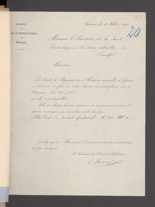 V176 Senckenberg Gesellschaft für Naturforschung, 17 - Korrespondenz über den Schriftentausch mit naturwissenschaftlichen Vereinigungen mit Ortsindex, Bd. 1