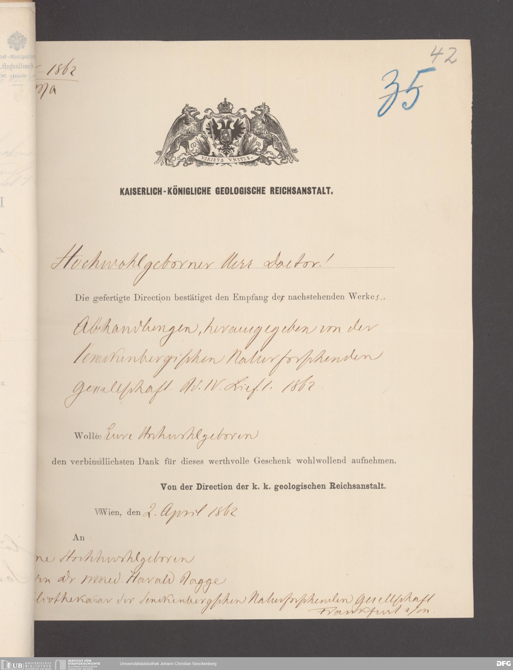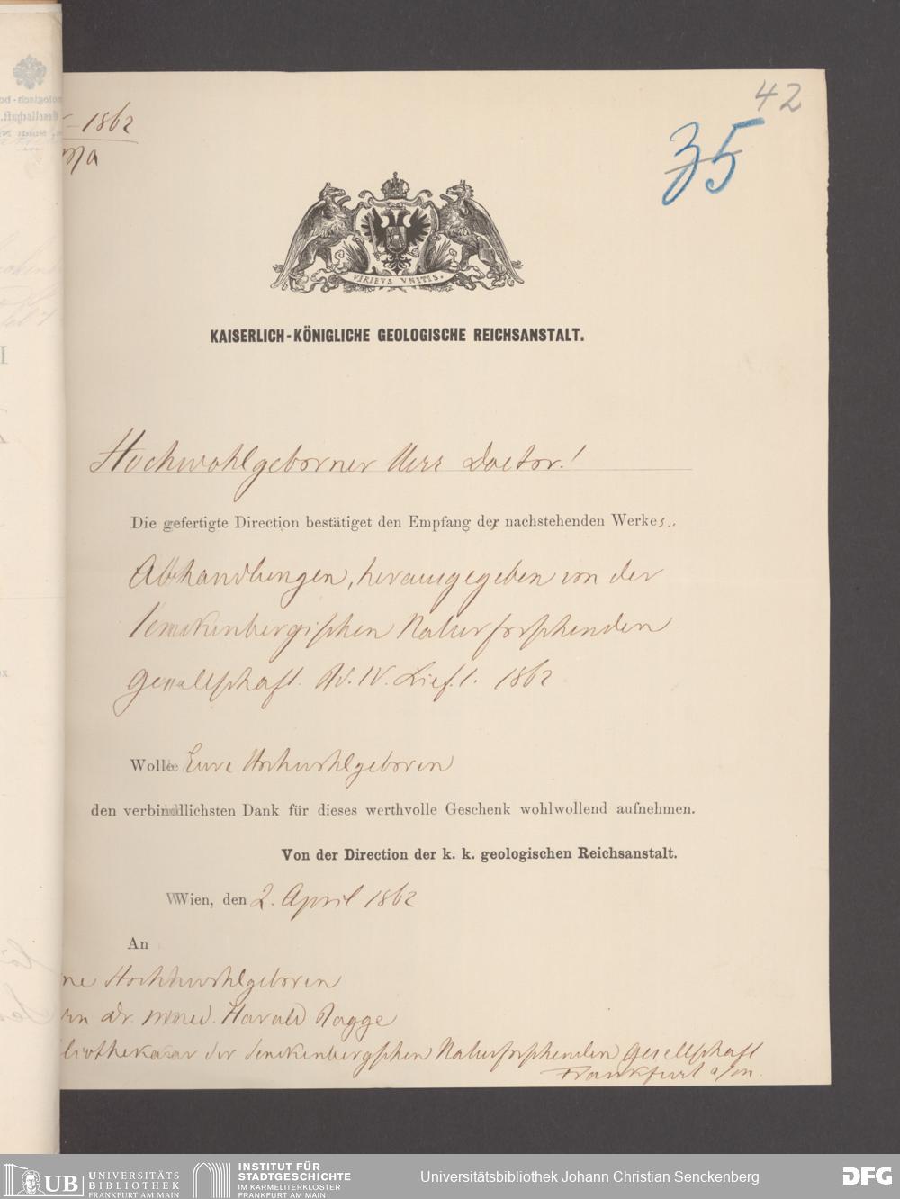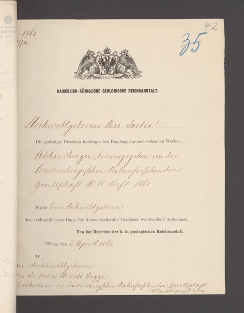 V176 Senckenberg Gesellschaft für Naturforschung, 17 - Korrespondenz über den Schriftentausch mit naturwissenschaftlichen Vereinigungen mit Ortsindex, Bd. 1