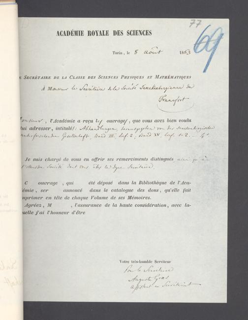 V176 Senckenberg Gesellschaft für Naturforschung, 17 - Korrespondenz über den Schriftentausch mit naturwissenschaftlichen Vereinigungen mit Ortsindex, Bd. 1