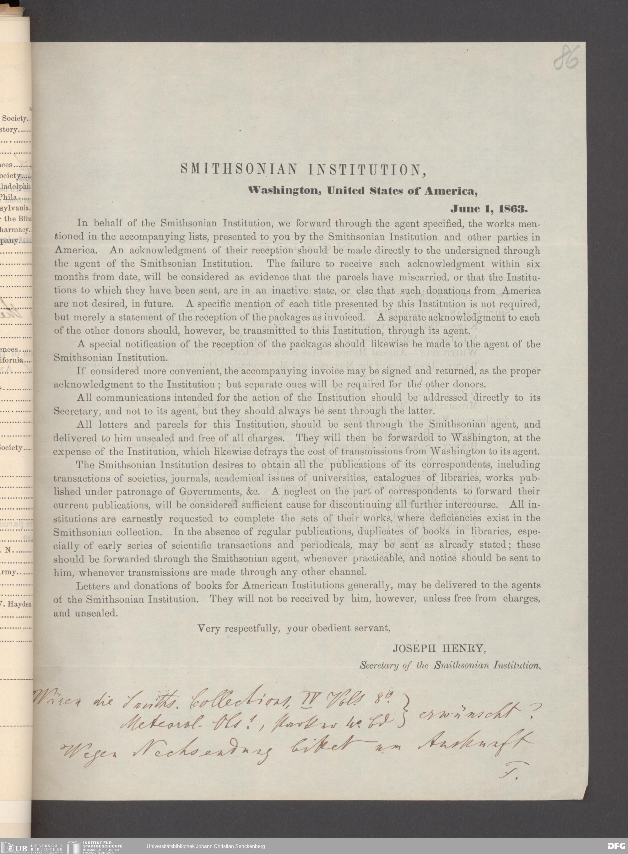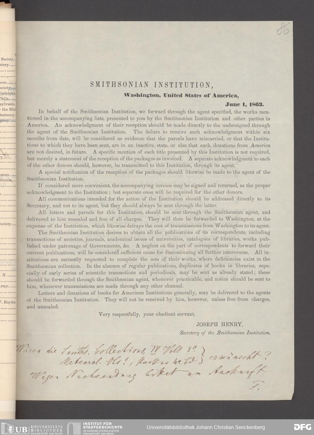 V176 Senckenberg Gesellschaft für Naturforschung, 17 - Korrespondenz über den Schriftentausch mit naturwissenschaftlichen Vereinigungen mit Ortsindex, Bd. 1