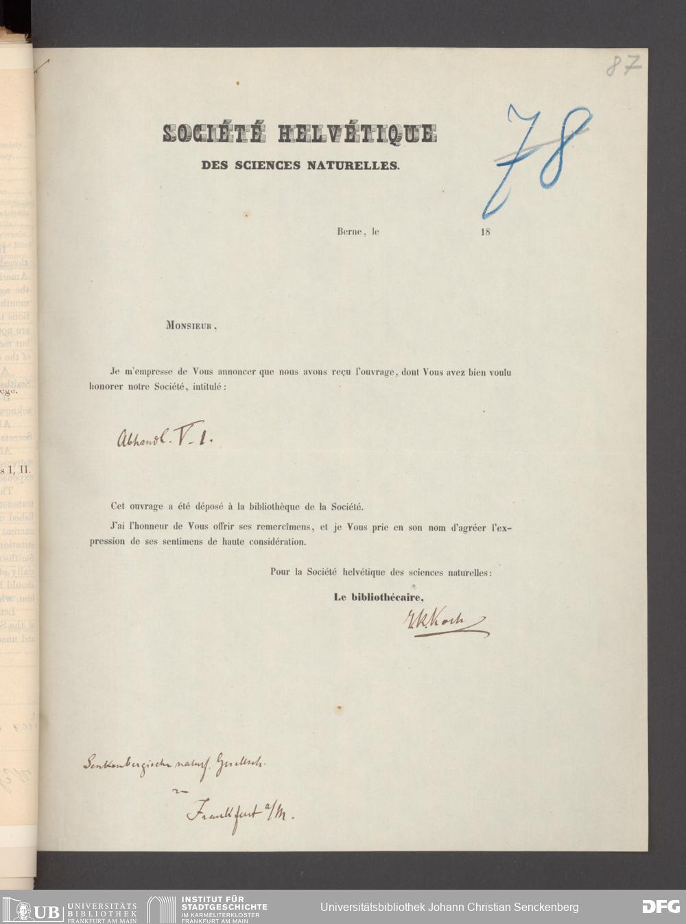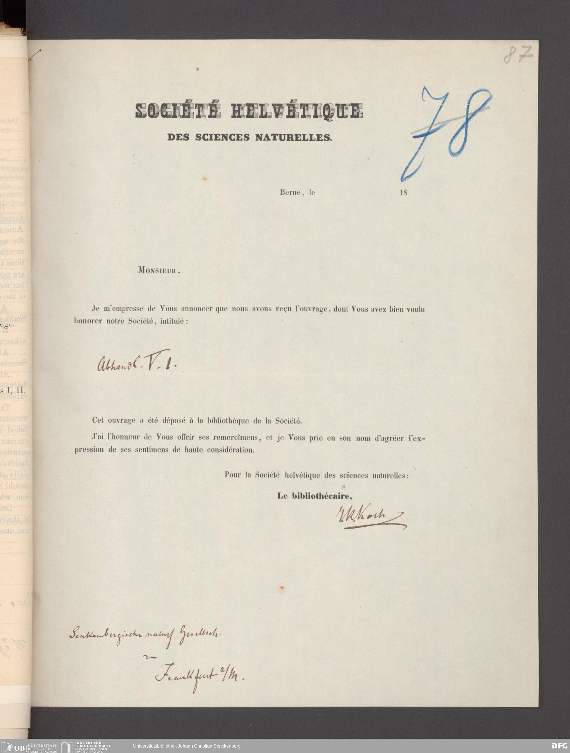 V176 Senckenberg Gesellschaft für Naturforschung, 17 - Korrespondenz über den Schriftentausch mit naturwissenschaftlichen Vereinigungen mit Ortsindex, Bd. 1