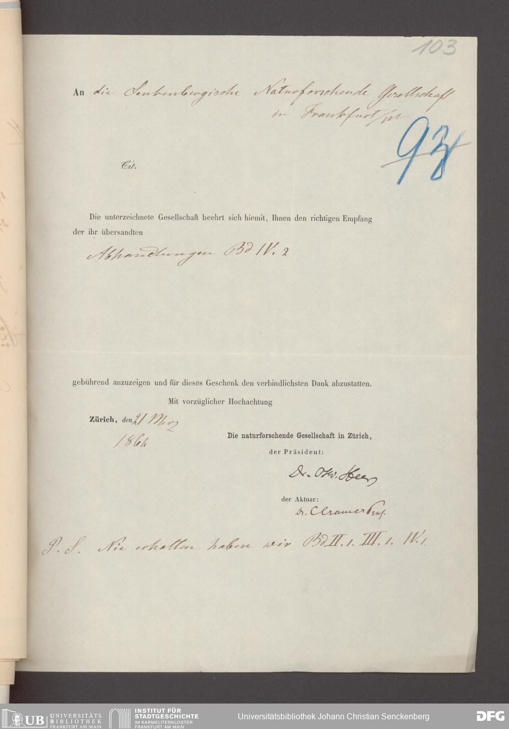 V176 Senckenberg Gesellschaft für Naturforschung, 17 - Korrespondenz über den Schriftentausch mit naturwissenschaftlichen Vereinigungen mit Ortsindex, Bd. 1
