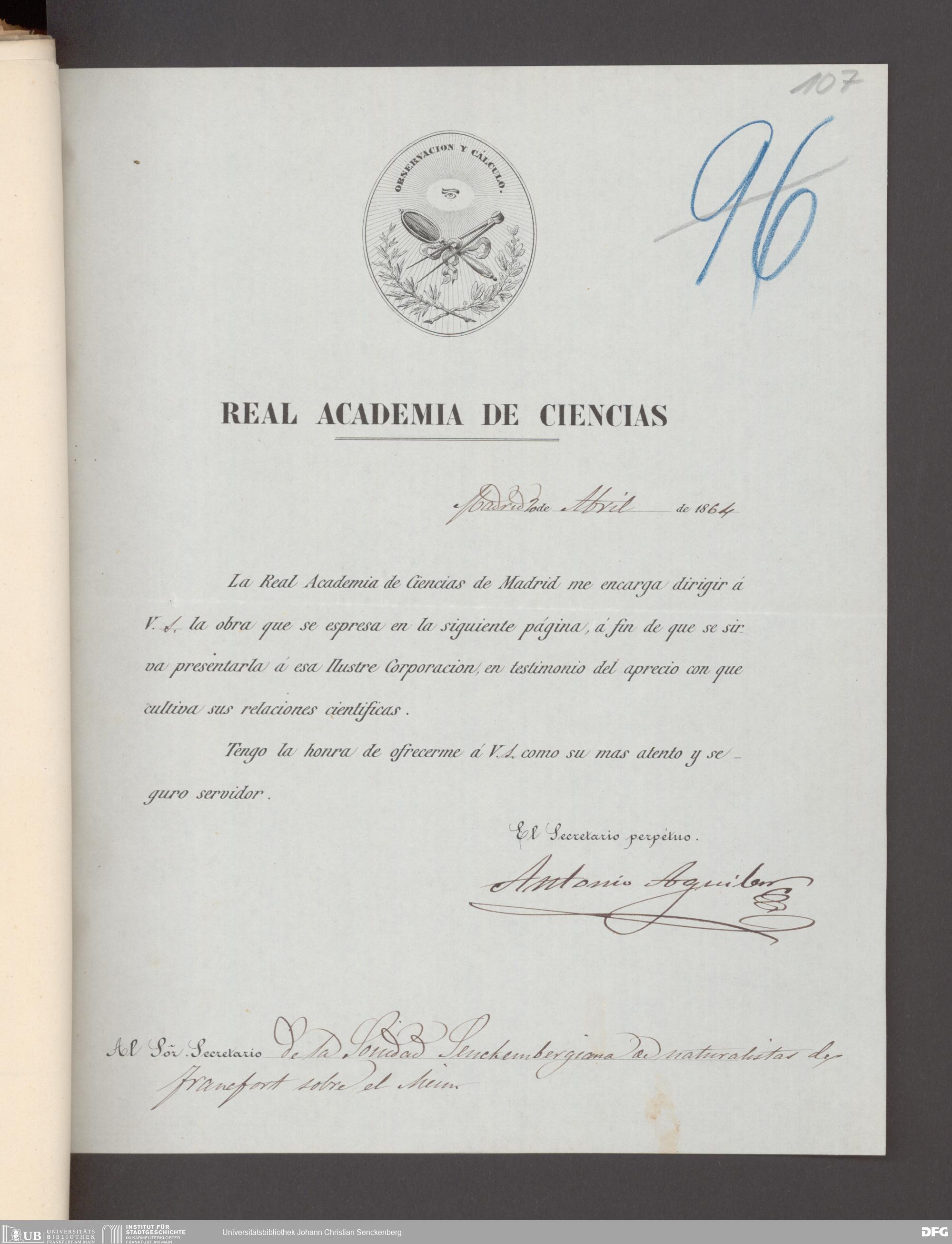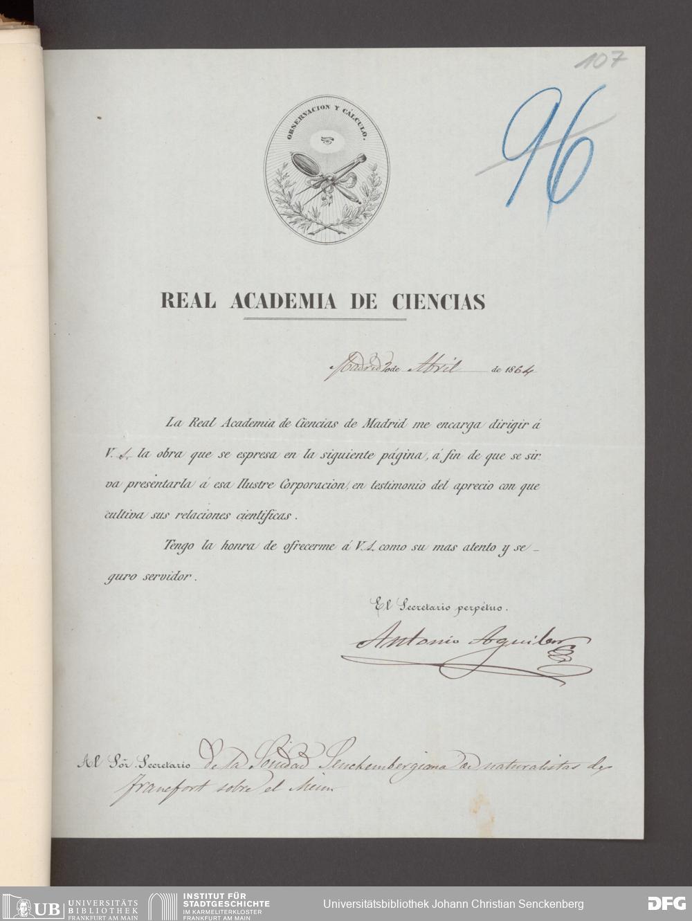 V176 Senckenberg Gesellschaft für Naturforschung, 17 - Korrespondenz über den Schriftentausch mit naturwissenschaftlichen Vereinigungen mit Ortsindex, Bd. 1