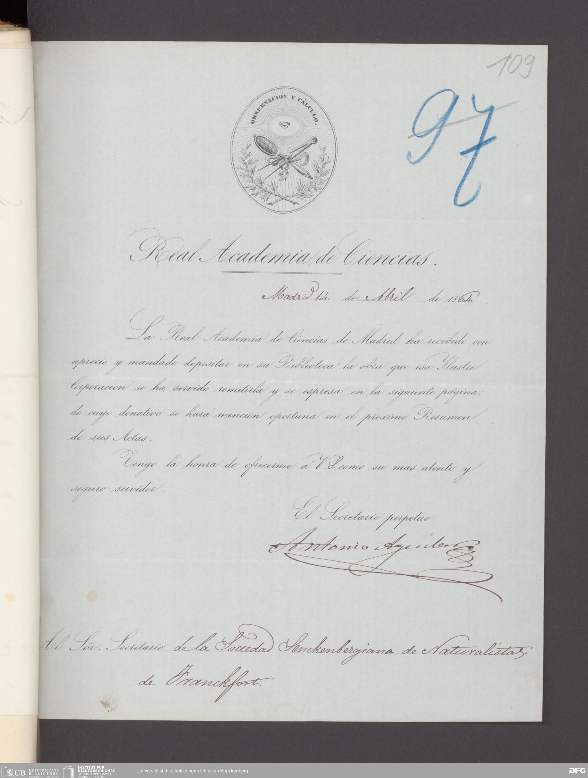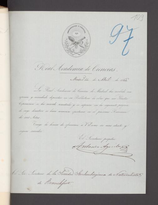 V176 Senckenberg Gesellschaft für Naturforschung, 17 - Korrespondenz über den Schriftentausch mit naturwissenschaftlichen Vereinigungen mit Ortsindex, Bd. 1