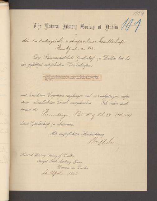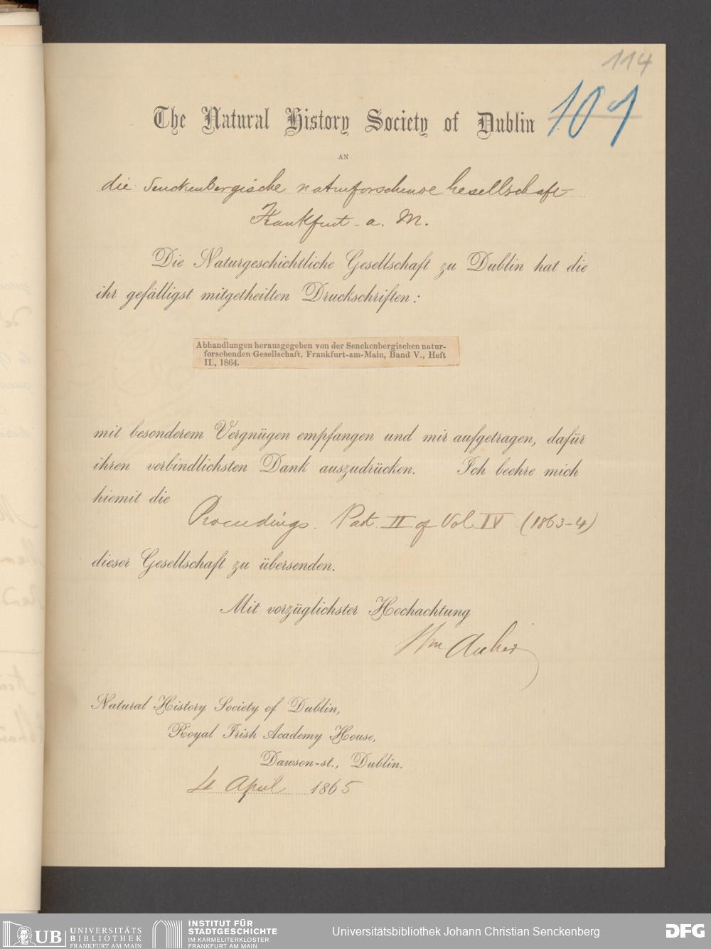 V176 Senckenberg Gesellschaft für Naturforschung, 17 - Korrespondenz über den Schriftentausch mit naturwissenschaftlichen Vereinigungen mit Ortsindex, Bd. 1