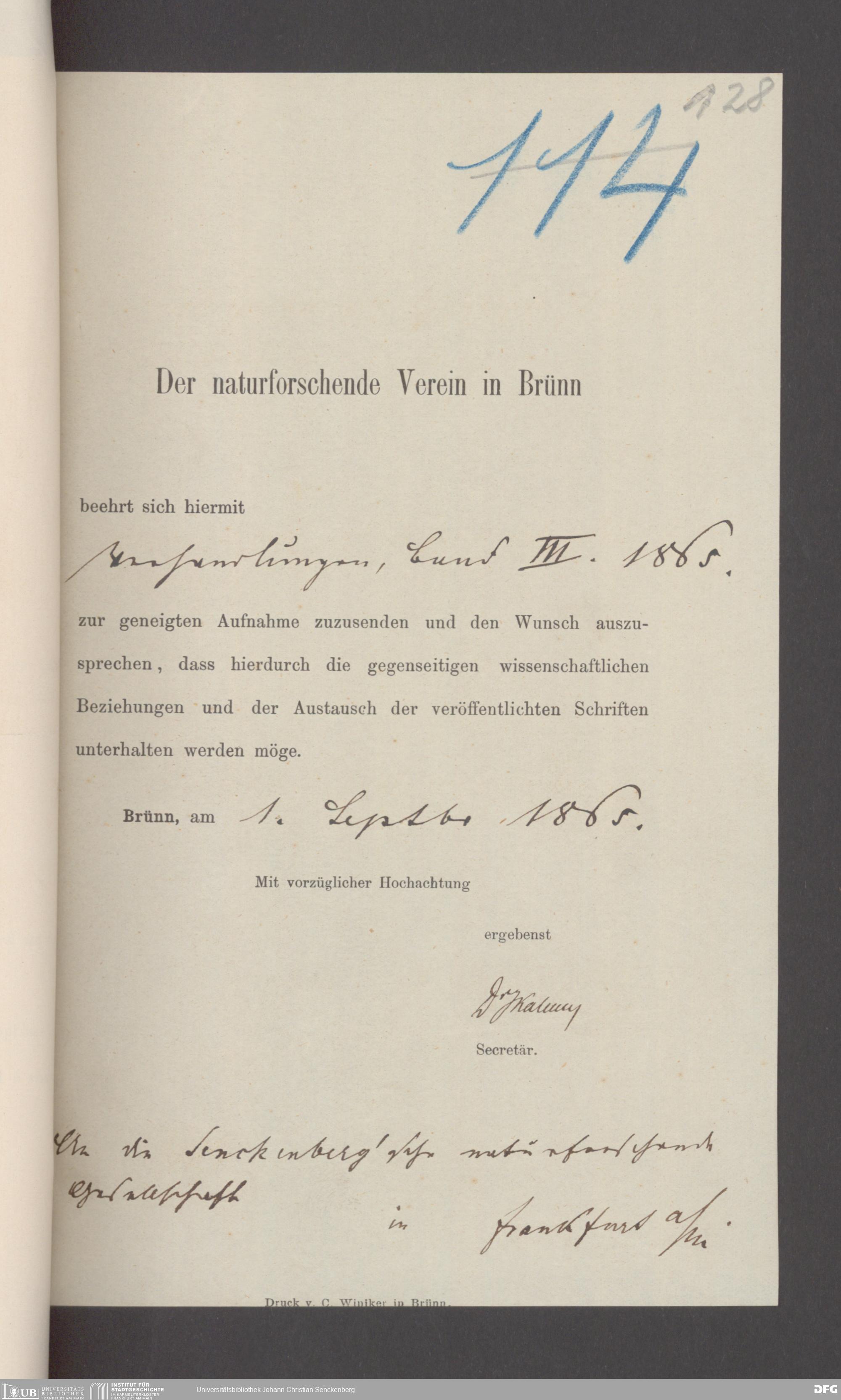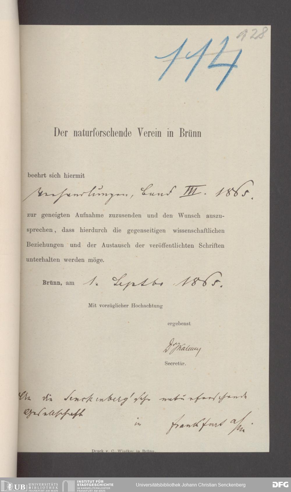 V176 Senckenberg Gesellschaft für Naturforschung, 17 - Korrespondenz über den Schriftentausch mit naturwissenschaftlichen Vereinigungen mit Ortsindex, Bd. 1