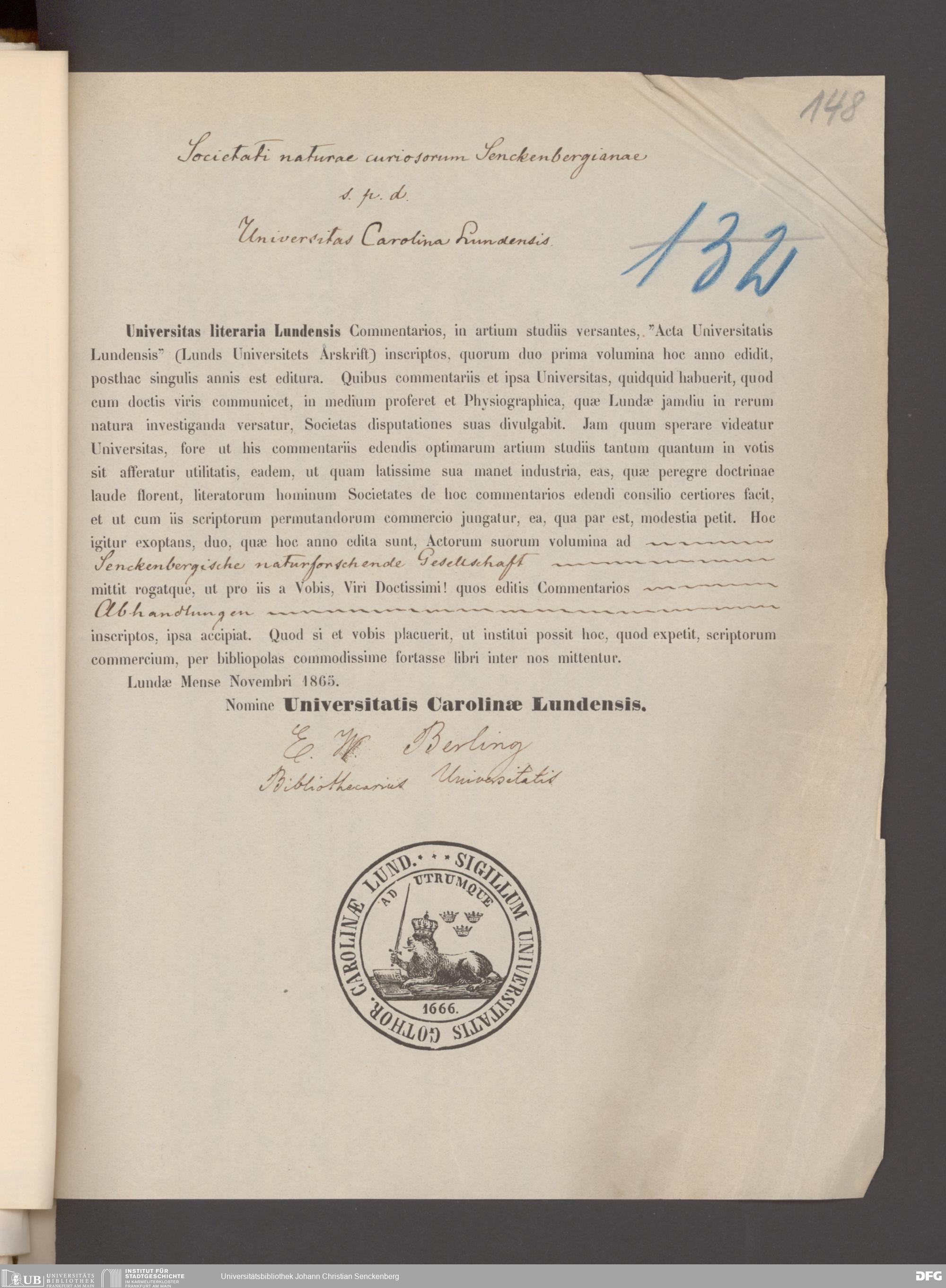 V176 Senckenberg Gesellschaft für Naturforschung, 17 - Korrespondenz über den Schriftentausch mit naturwissenschaftlichen Vereinigungen mit Ortsindex, Bd. 1