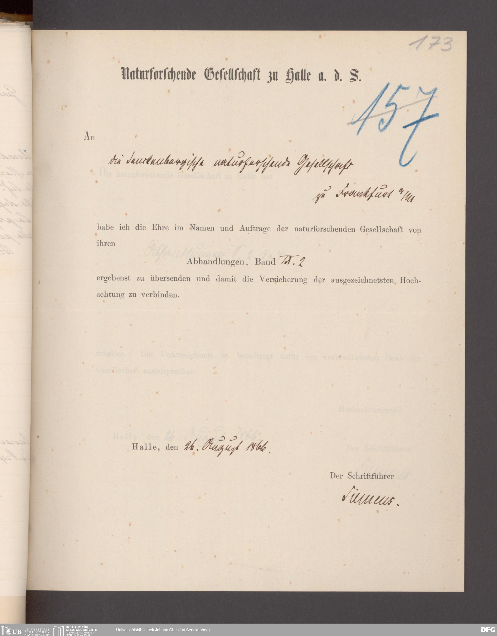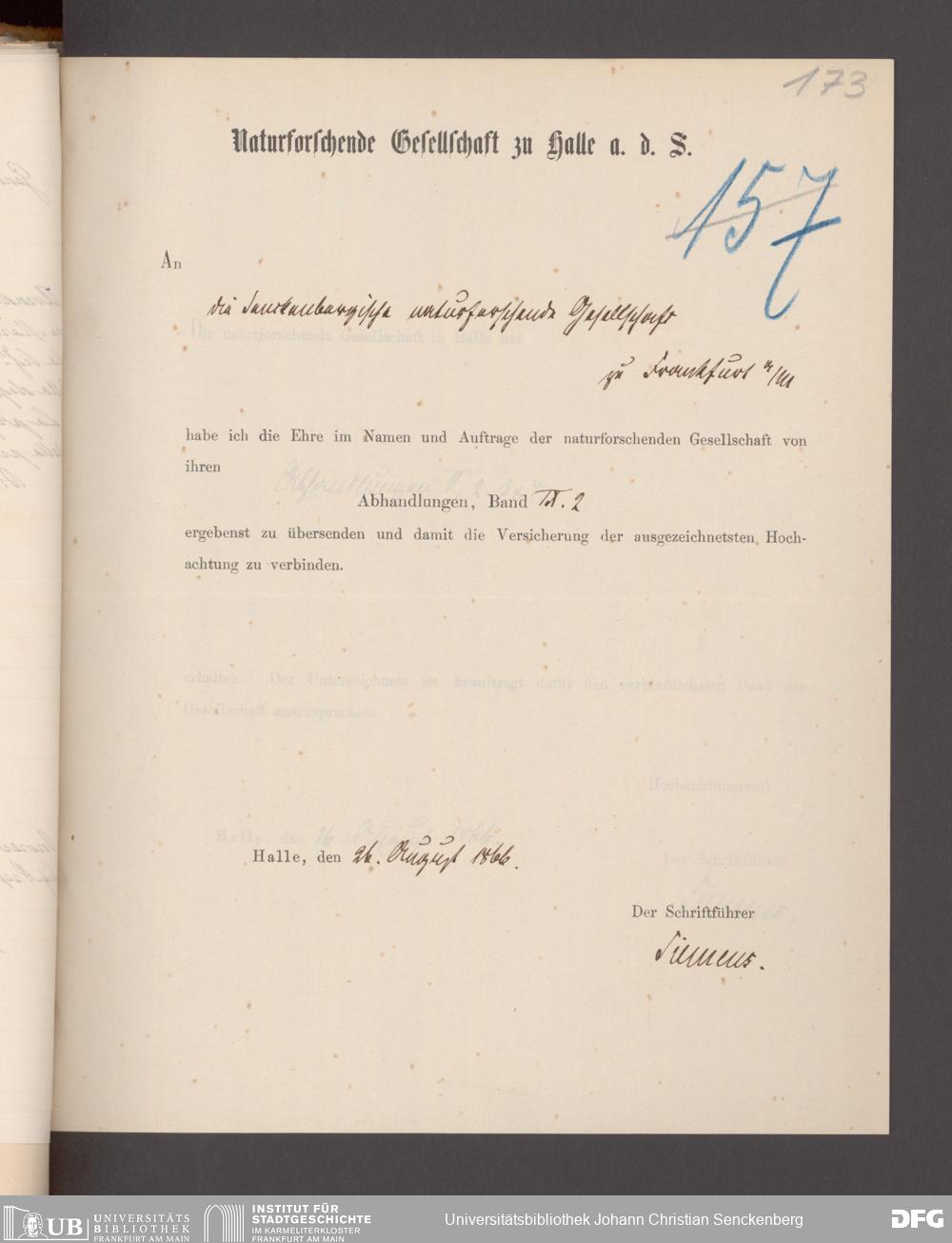 V176 Senckenberg Gesellschaft für Naturforschung, 17 - Korrespondenz über den Schriftentausch mit naturwissenschaftlichen Vereinigungen mit Ortsindex, Bd. 1