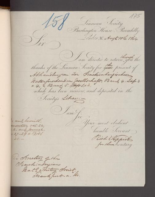 V176 Senckenberg Gesellschaft für Naturforschung, 17 - Korrespondenz über den Schriftentausch mit naturwissenschaftlichen Vereinigungen mit Ortsindex, Bd. 1