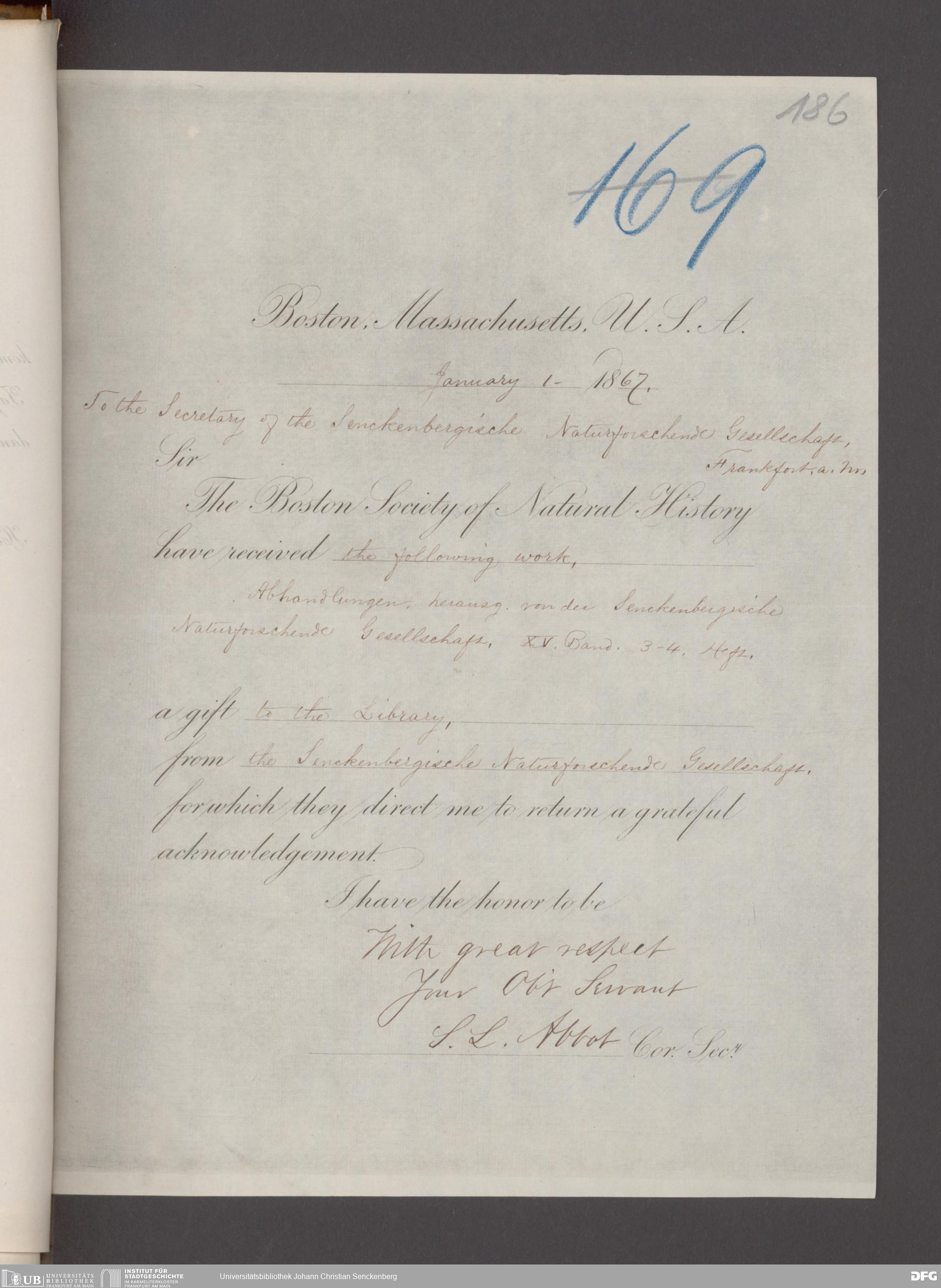 V176 Senckenberg Gesellschaft für Naturforschung, 17 - Korrespondenz über den Schriftentausch mit naturwissenschaftlichen Vereinigungen mit Ortsindex, Bd. 1