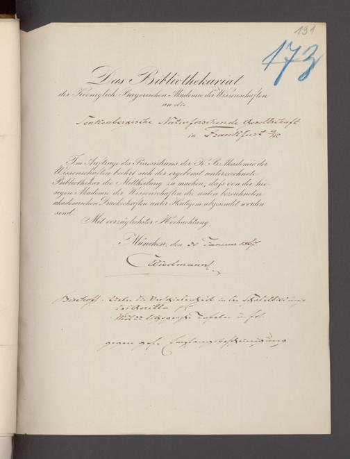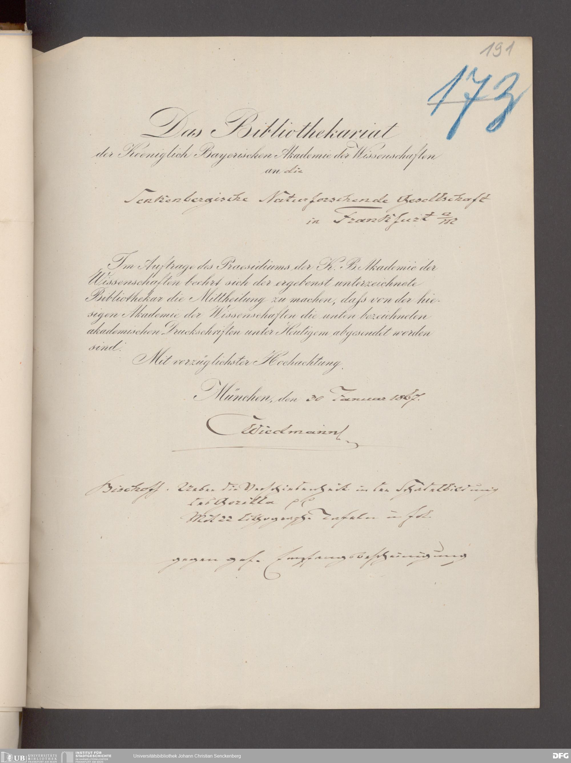 V176 Senckenberg Gesellschaft für Naturforschung, 17 - Korrespondenz über den Schriftentausch mit naturwissenschaftlichen Vereinigungen mit Ortsindex, Bd. 1