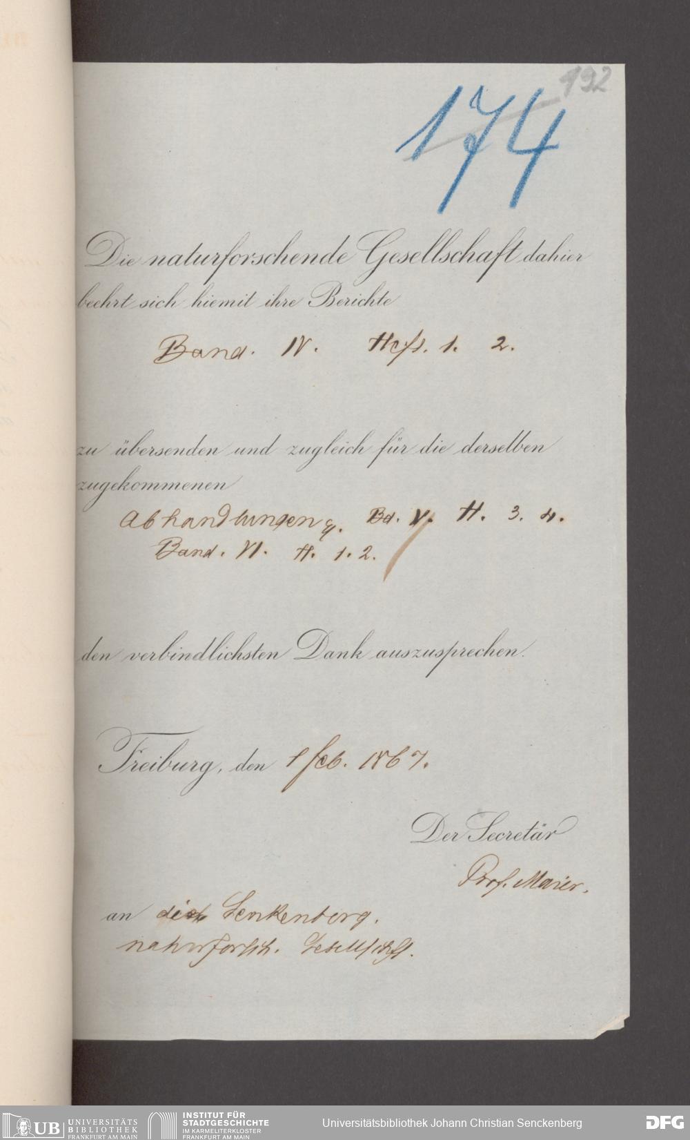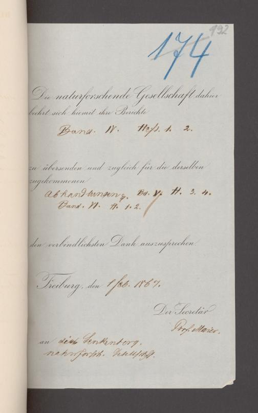 V176 Senckenberg Gesellschaft für Naturforschung, 17 - Korrespondenz über den Schriftentausch mit naturwissenschaftlichen Vereinigungen mit Ortsindex, Bd. 1