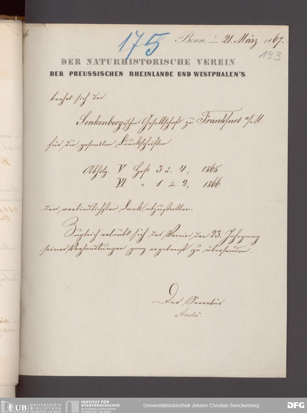 V176 Senckenberg Gesellschaft für Naturforschung, 17 - Korrespondenz über den Schriftentausch mit naturwissenschaftlichen Vereinigungen mit Ortsindex, Bd. 1