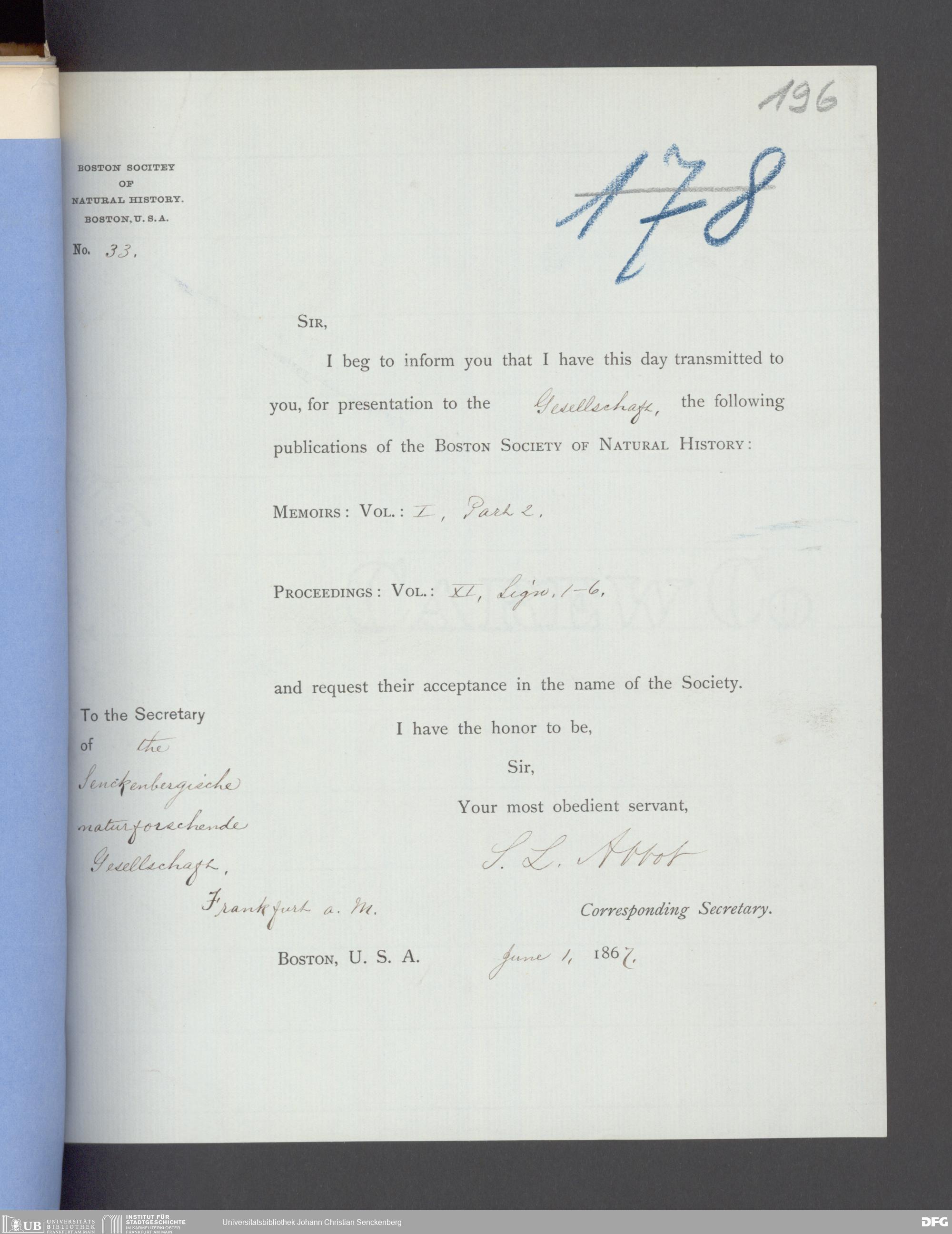 V176 Senckenberg Gesellschaft für Naturforschung, 17 - Korrespondenz über den Schriftentausch mit naturwissenschaftlichen Vereinigungen mit Ortsindex, Bd. 1