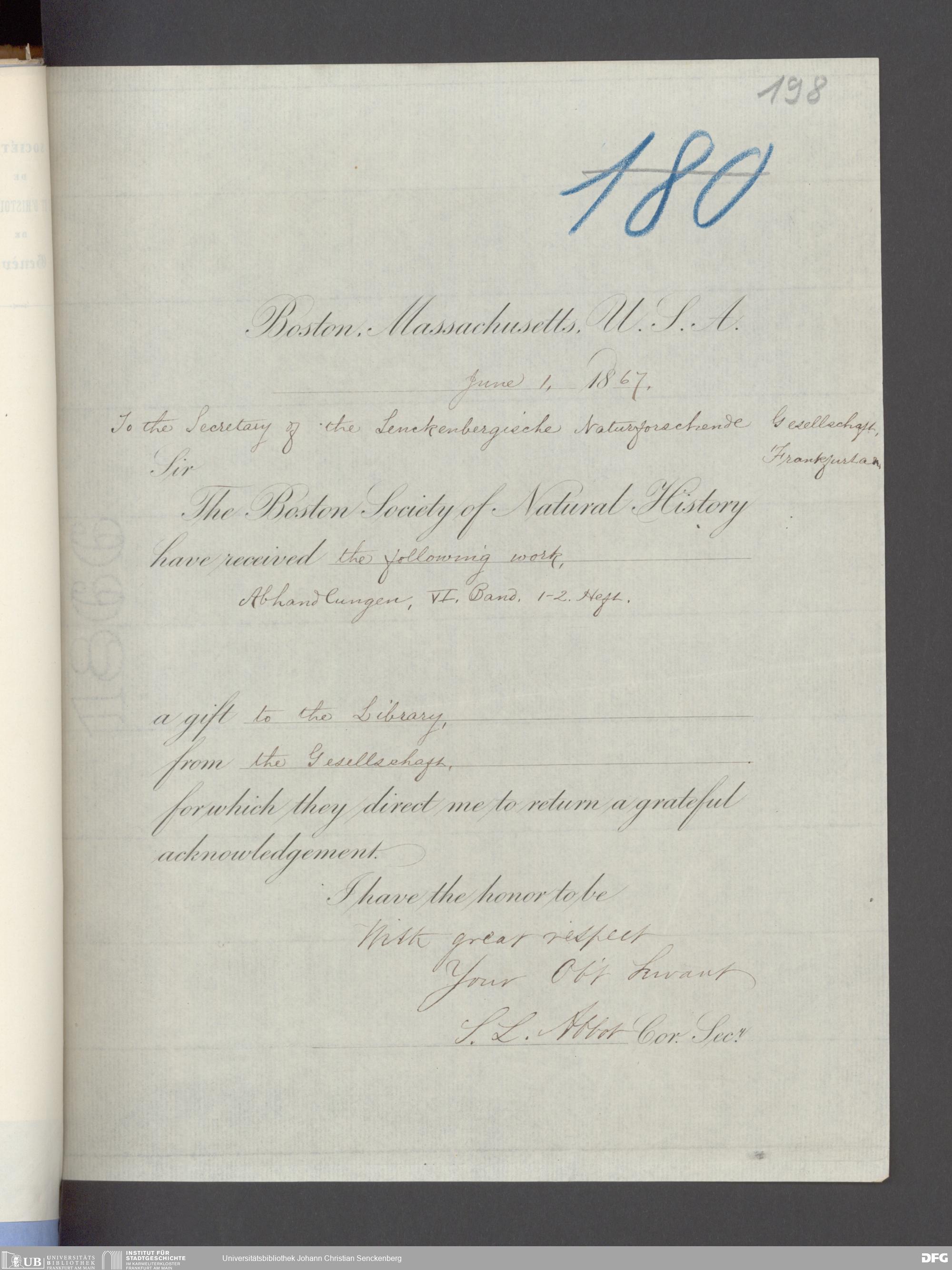 V176 Senckenberg Gesellschaft für Naturforschung, 17 - Korrespondenz über den Schriftentausch mit naturwissenschaftlichen Vereinigungen mit Ortsindex, Bd. 1