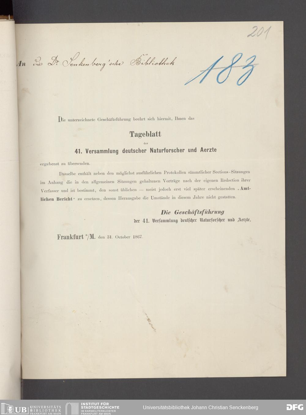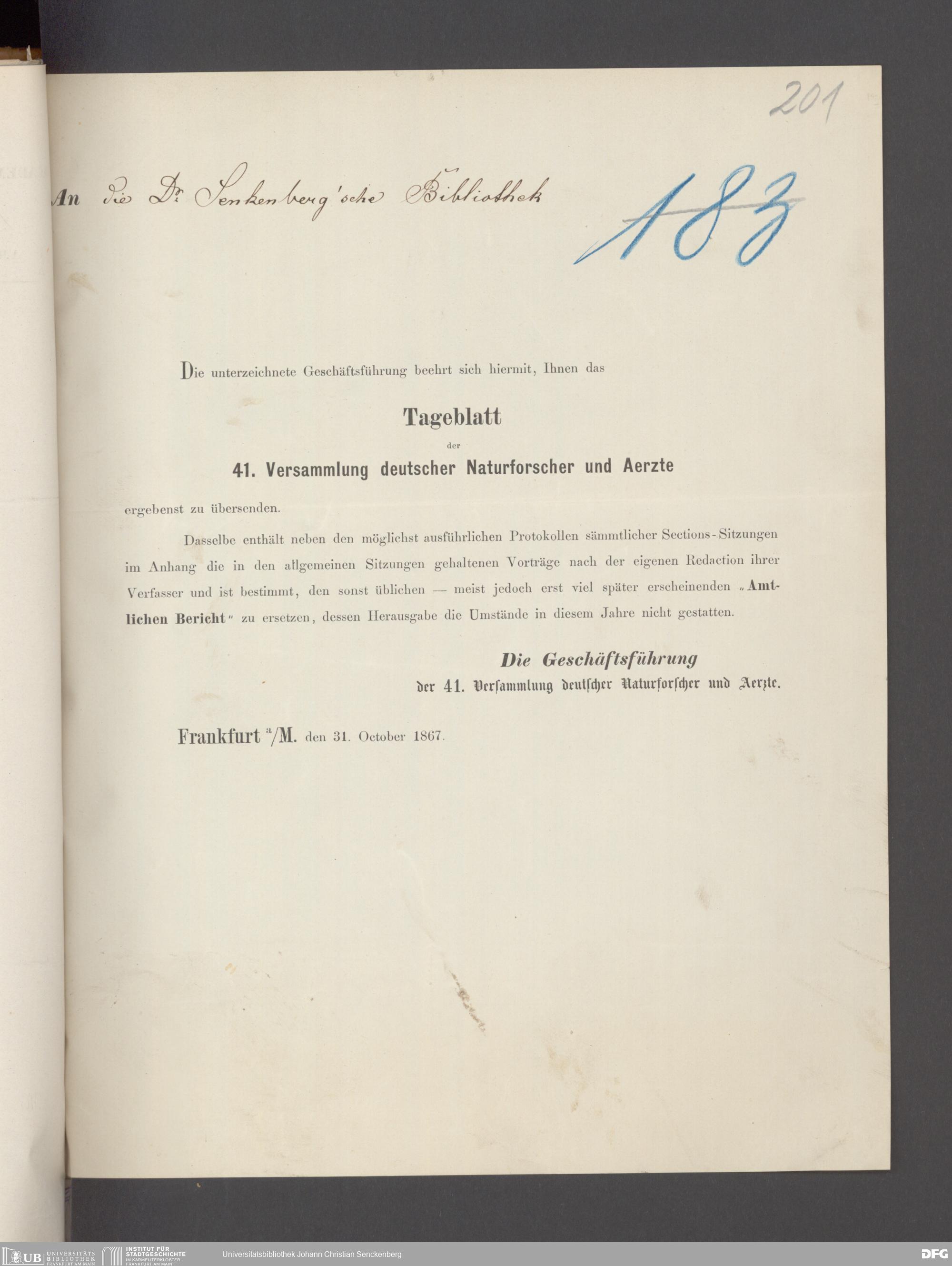 V176 Senckenberg Gesellschaft für Naturforschung, 17 - Korrespondenz über den Schriftentausch mit naturwissenschaftlichen Vereinigungen mit Ortsindex, Bd. 1