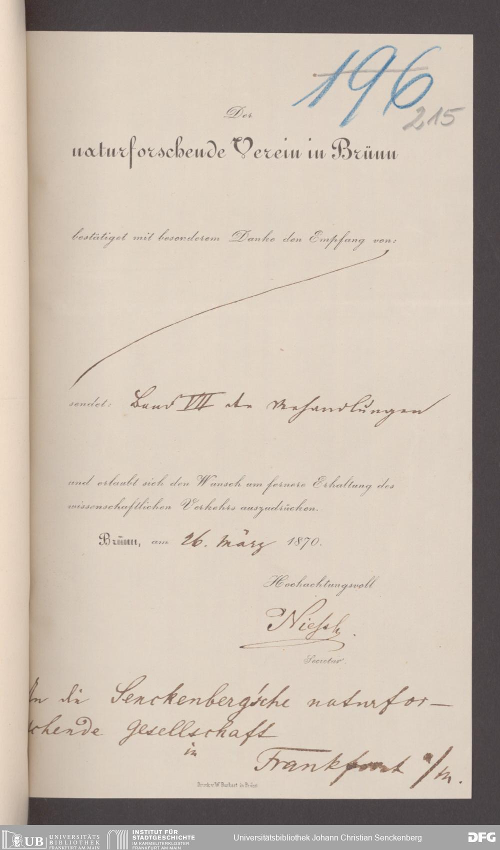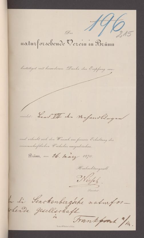 V176 Senckenberg Gesellschaft für Naturforschung, 17 - Korrespondenz über den Schriftentausch mit naturwissenschaftlichen Vereinigungen mit Ortsindex, Bd. 1