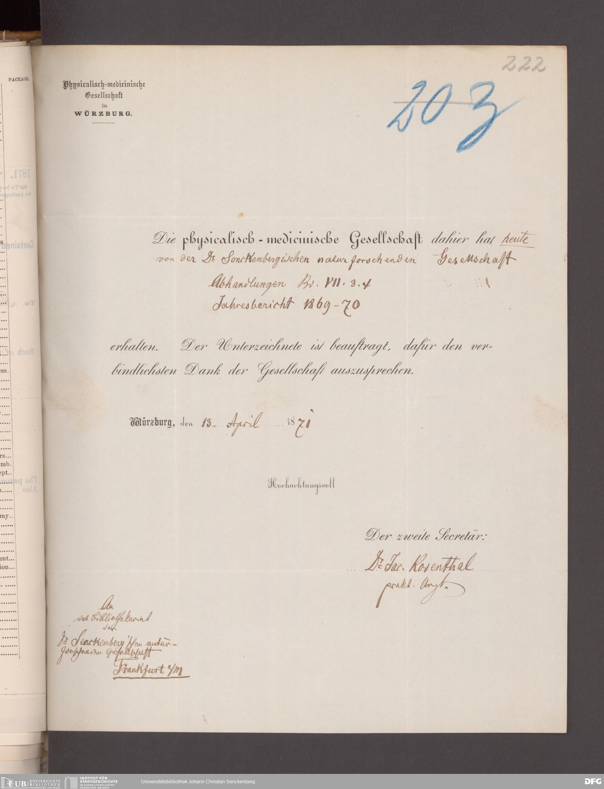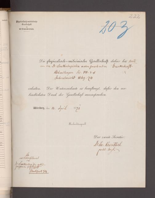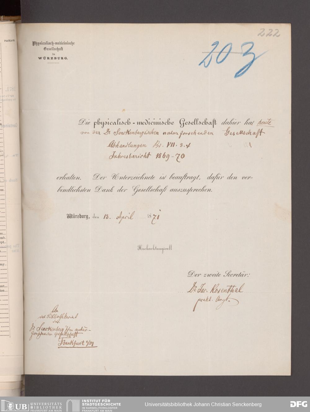 V176 Senckenberg Gesellschaft für Naturforschung, 17 - Korrespondenz über den Schriftentausch mit naturwissenschaftlichen Vereinigungen mit Ortsindex, Bd. 1