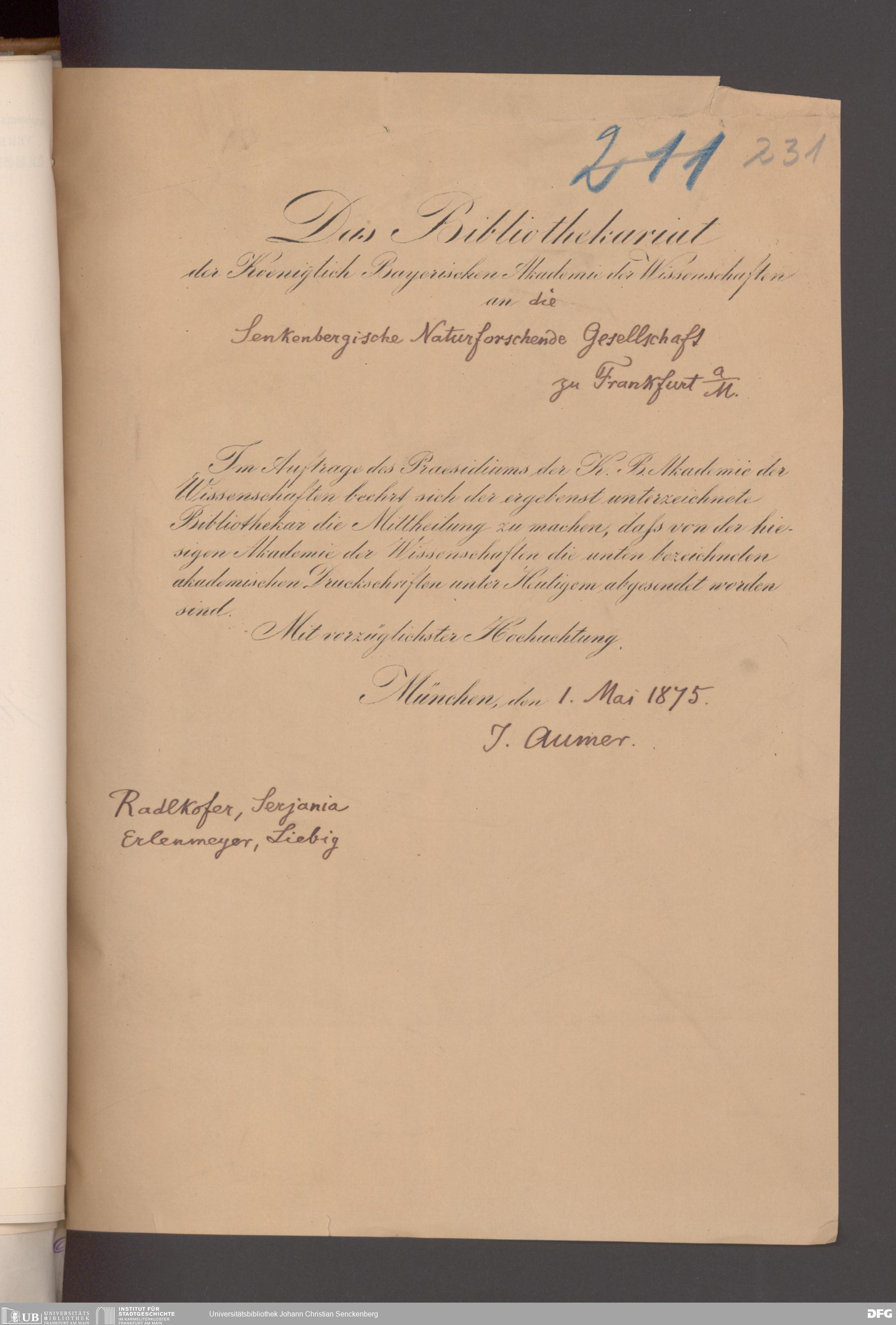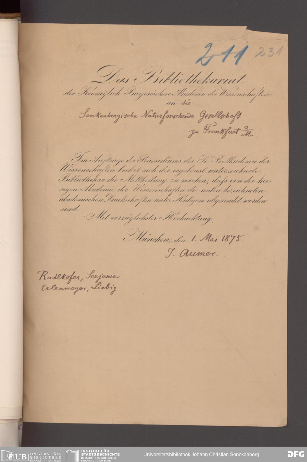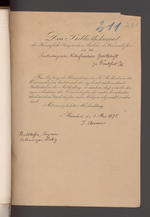 V176 Senckenberg Gesellschaft für Naturforschung, 17 - Korrespondenz über den Schriftentausch mit naturwissenschaftlichen Vereinigungen mit Ortsindex, Bd. 1