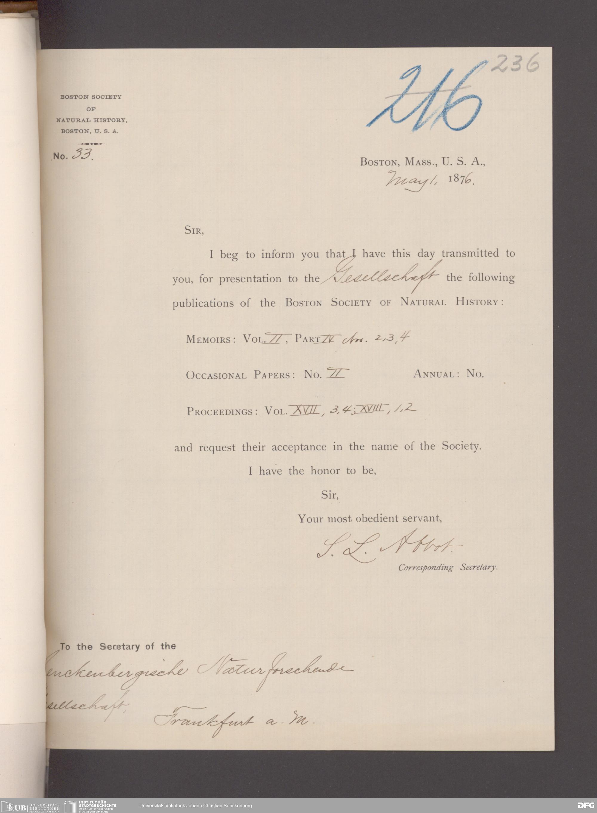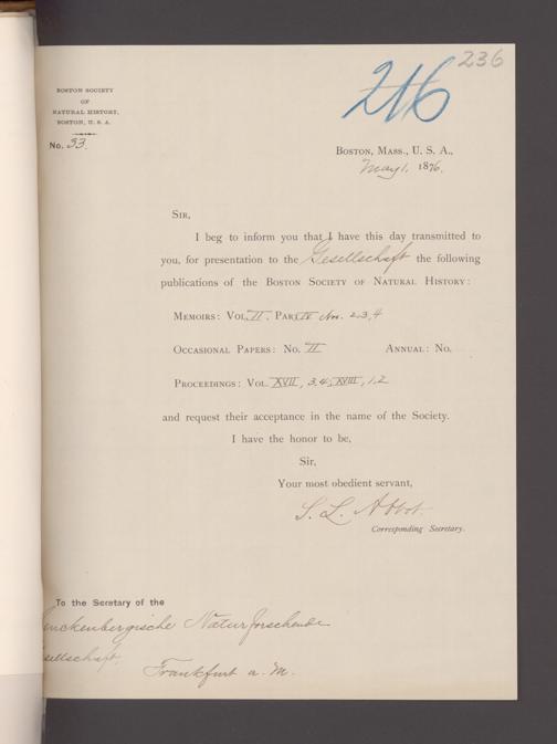 V176 Senckenberg Gesellschaft für Naturforschung, 17 - Korrespondenz über den Schriftentausch mit naturwissenschaftlichen Vereinigungen mit Ortsindex, Bd. 1