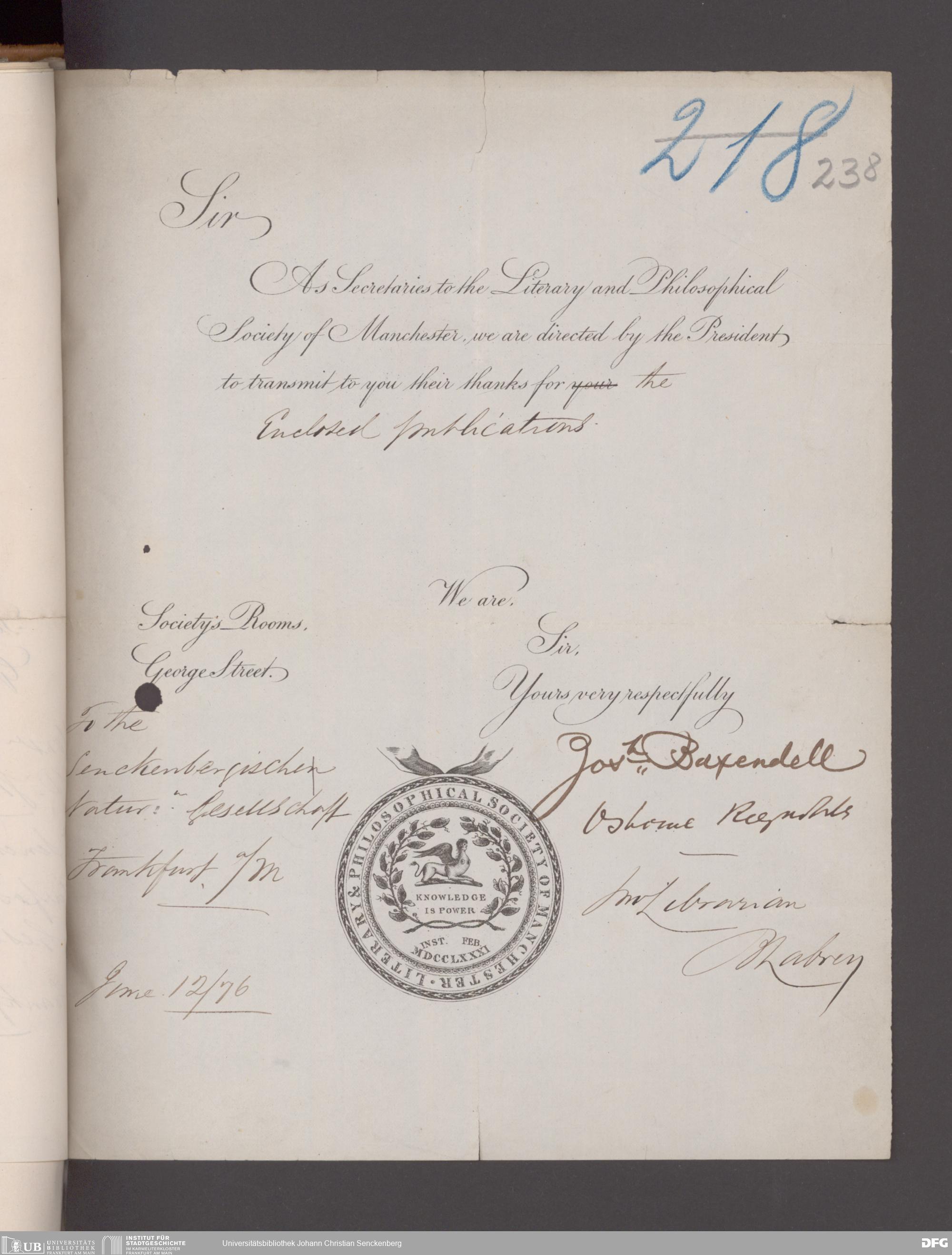 V176 Senckenberg Gesellschaft für Naturforschung, 17 - Korrespondenz über den Schriftentausch mit naturwissenschaftlichen Vereinigungen mit Ortsindex, Bd. 1