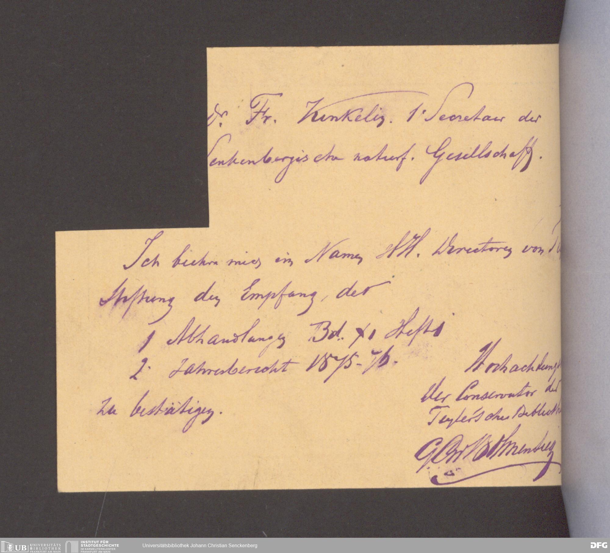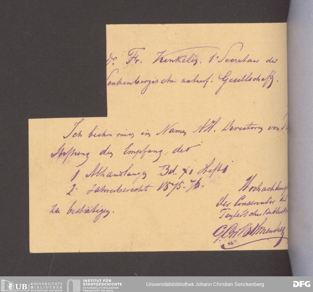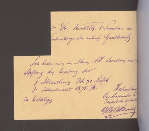 V176 Senckenberg Gesellschaft für Naturforschung, 17 - Korrespondenz über den Schriftentausch mit naturwissenschaftlichen Vereinigungen mit Ortsindex, Bd. 1