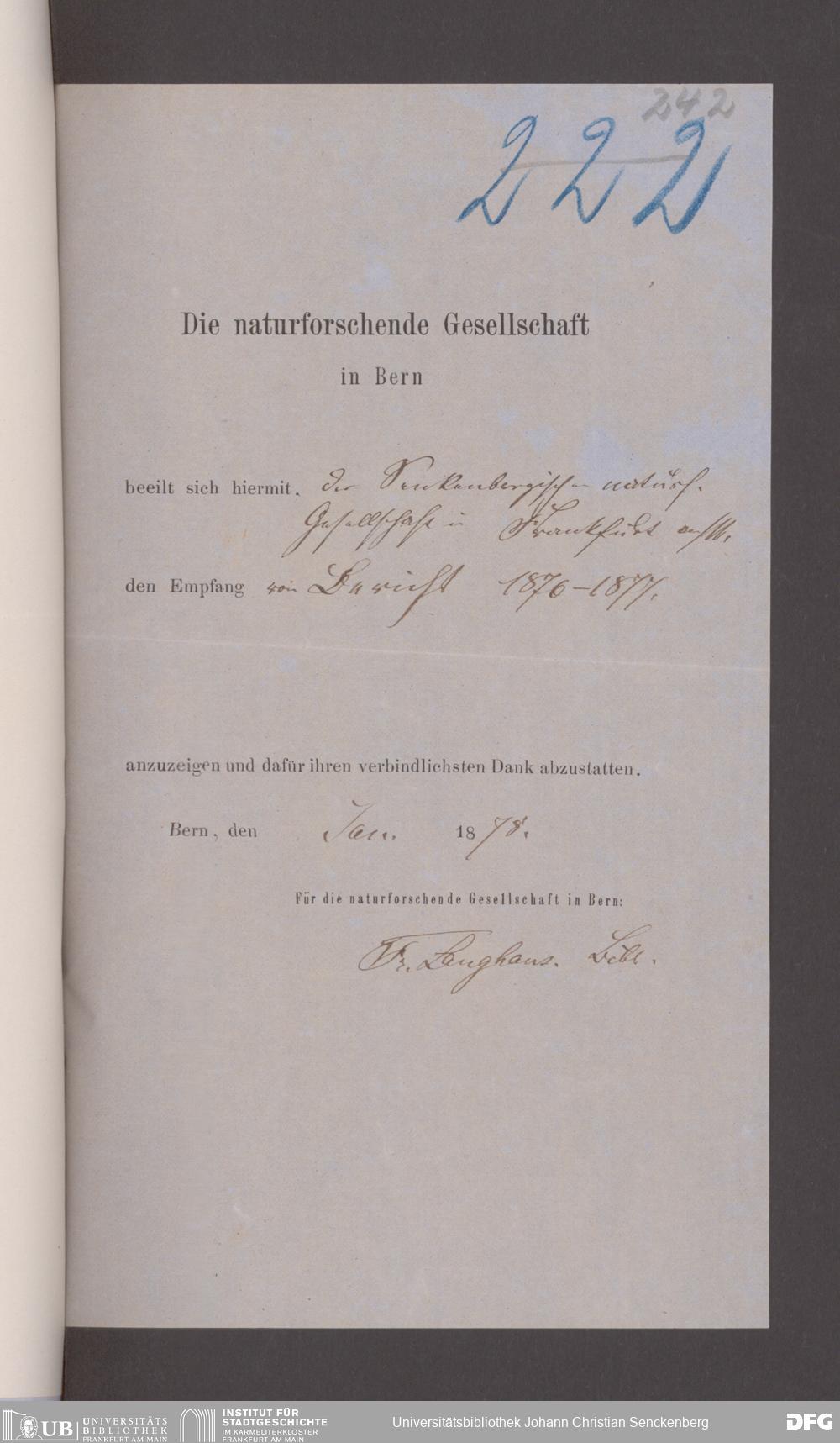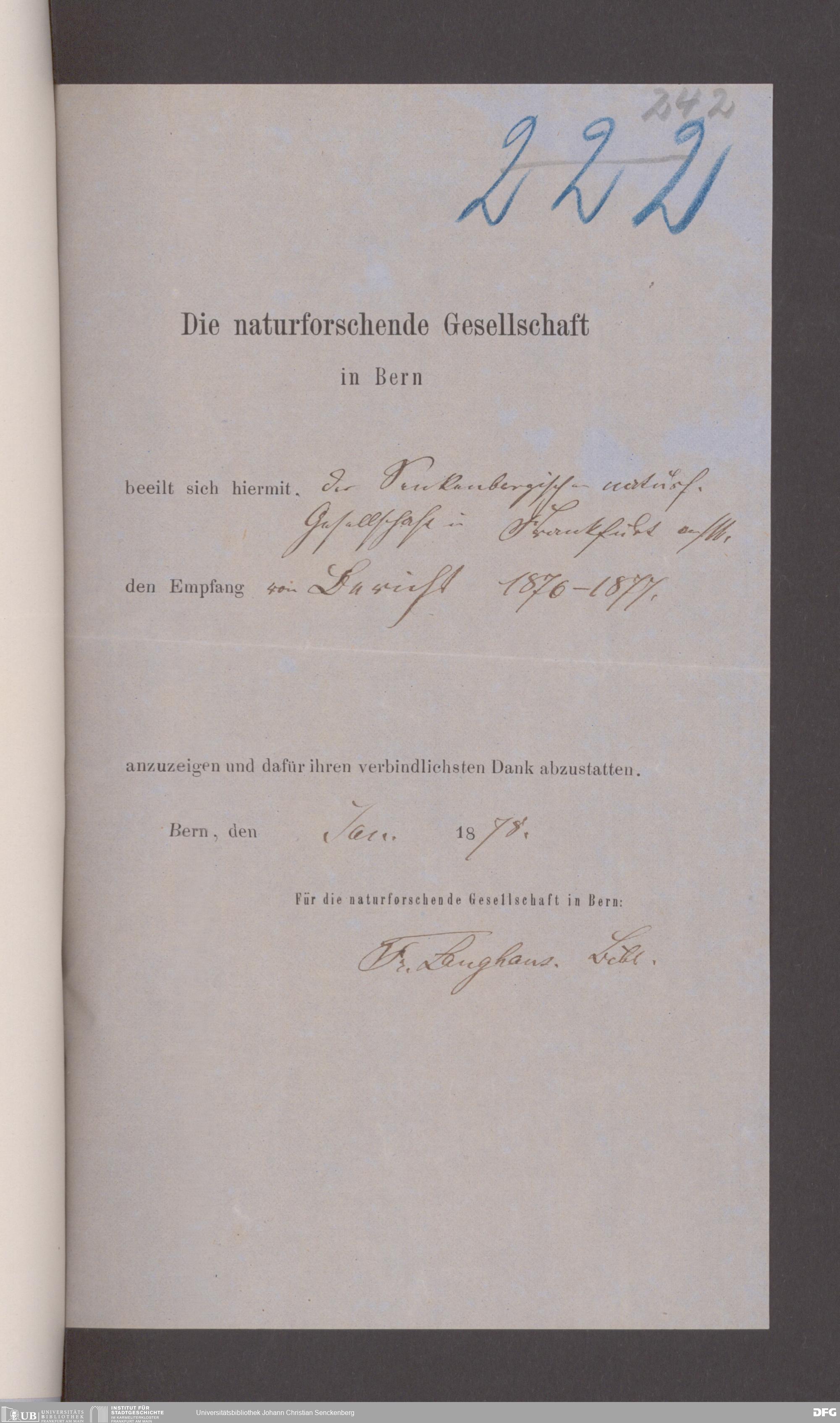 V176 Senckenberg Gesellschaft für Naturforschung, 17 - Korrespondenz über den Schriftentausch mit naturwissenschaftlichen Vereinigungen mit Ortsindex, Bd. 1