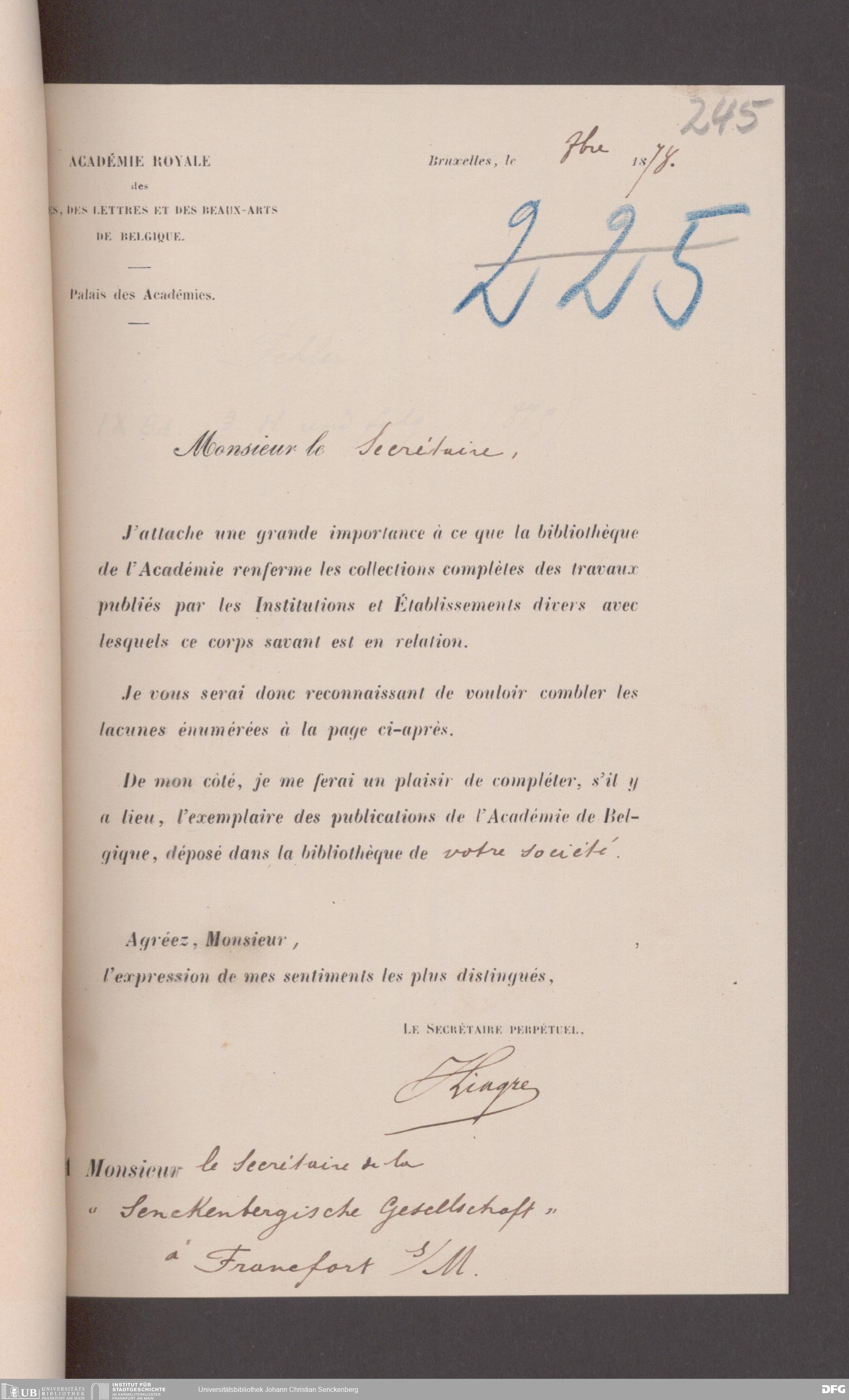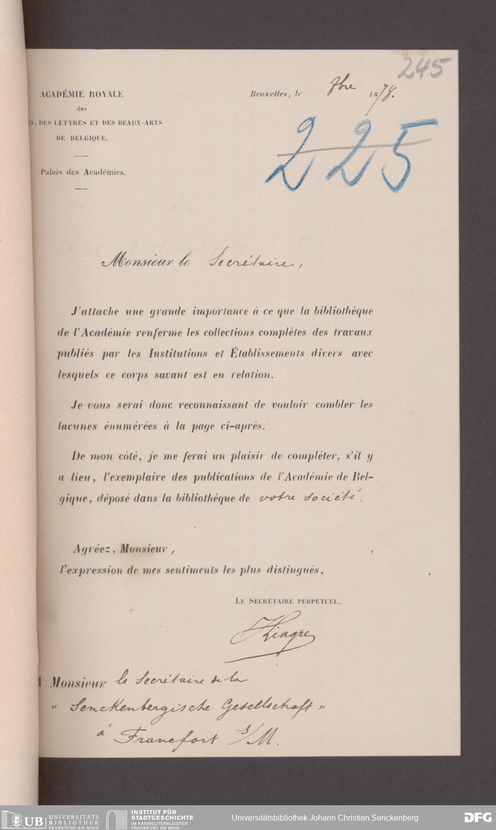 V176 Senckenberg Gesellschaft für Naturforschung, 17 - Korrespondenz über den Schriftentausch mit naturwissenschaftlichen Vereinigungen mit Ortsindex, Bd. 1
