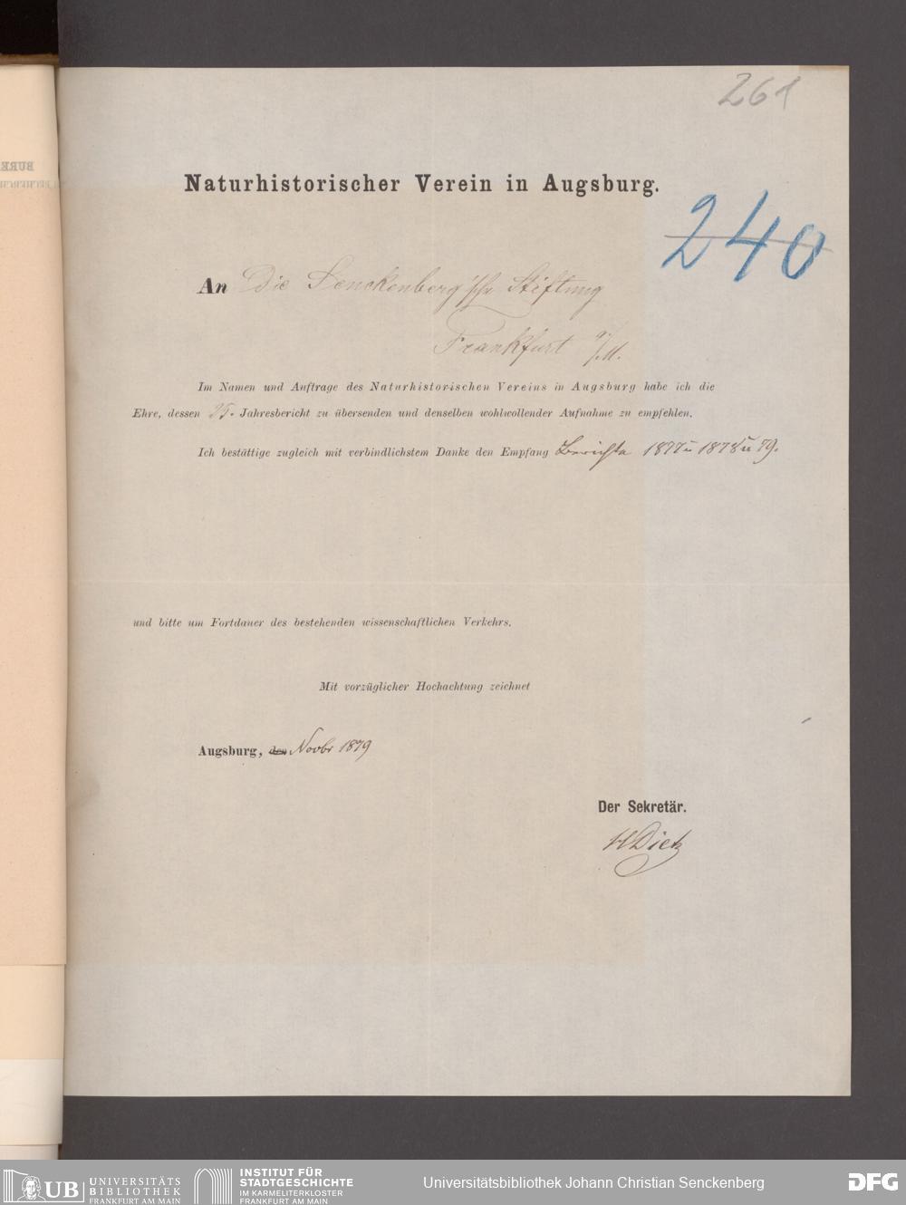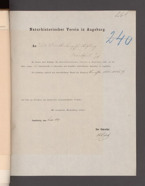V176 Senckenberg Gesellschaft für Naturforschung, 17 - Korrespondenz über den Schriftentausch mit naturwissenschaftlichen Vereinigungen mit Ortsindex, Bd. 1