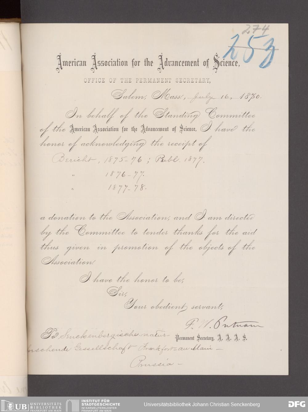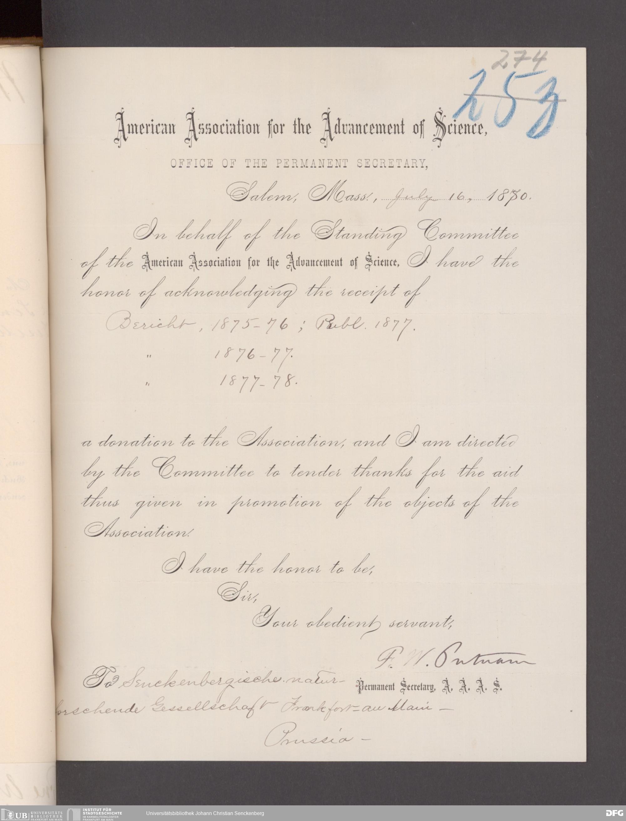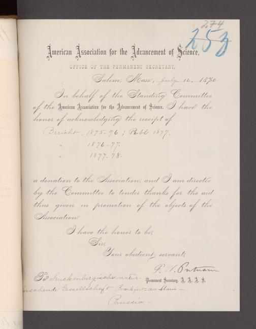 V176 Senckenberg Gesellschaft für Naturforschung, 17 - Korrespondenz über den Schriftentausch mit naturwissenschaftlichen Vereinigungen mit Ortsindex, Bd. 1