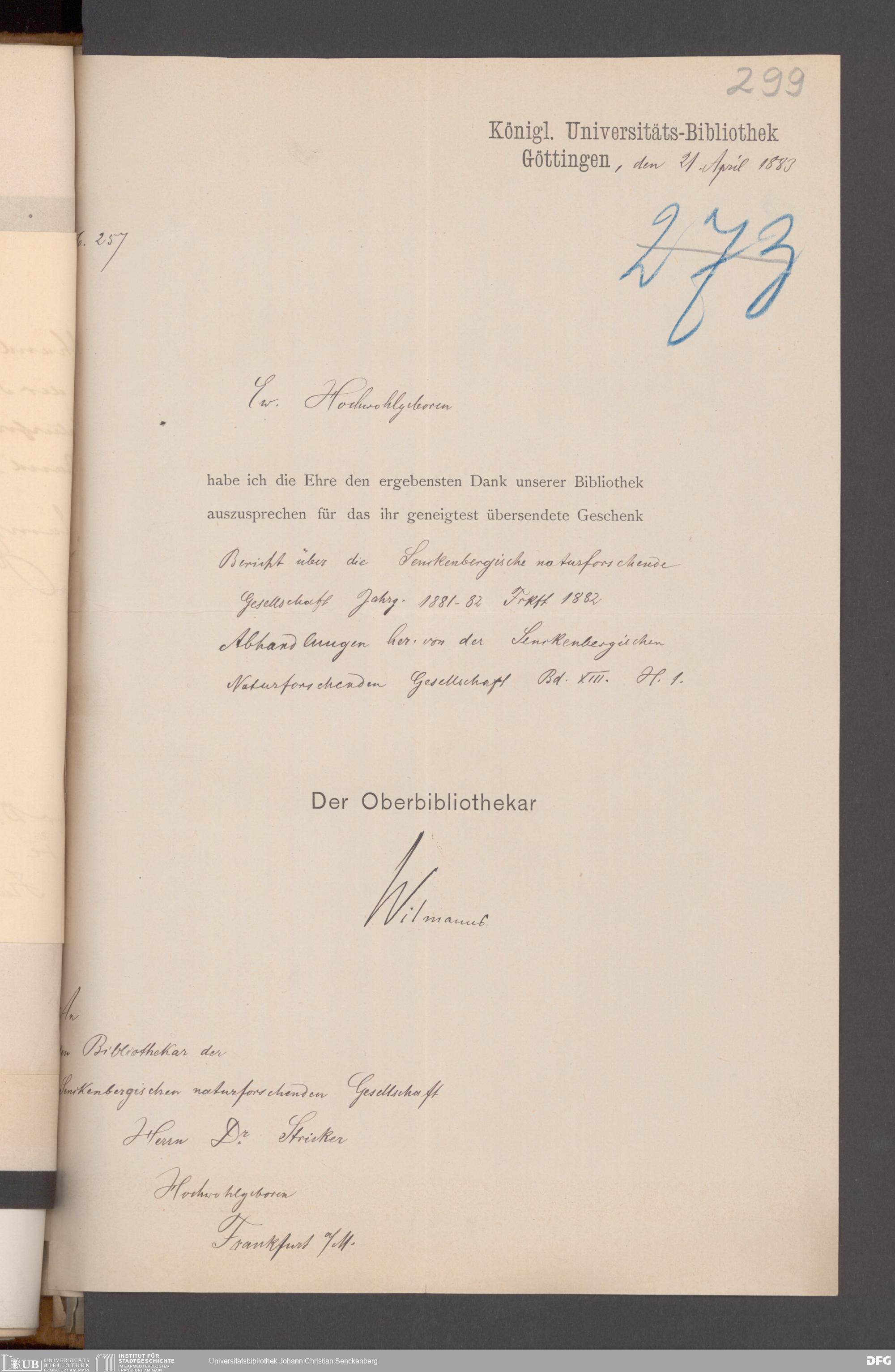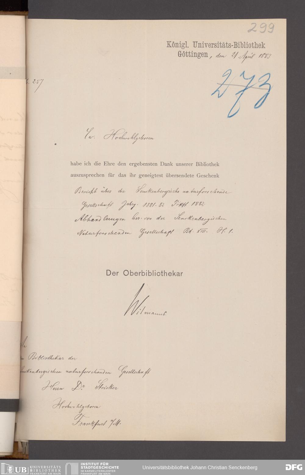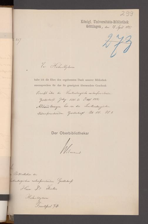 V176 Senckenberg Gesellschaft für Naturforschung, 17 - Korrespondenz über den Schriftentausch mit naturwissenschaftlichen Vereinigungen mit Ortsindex, Bd. 1