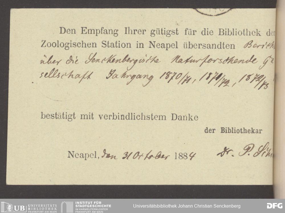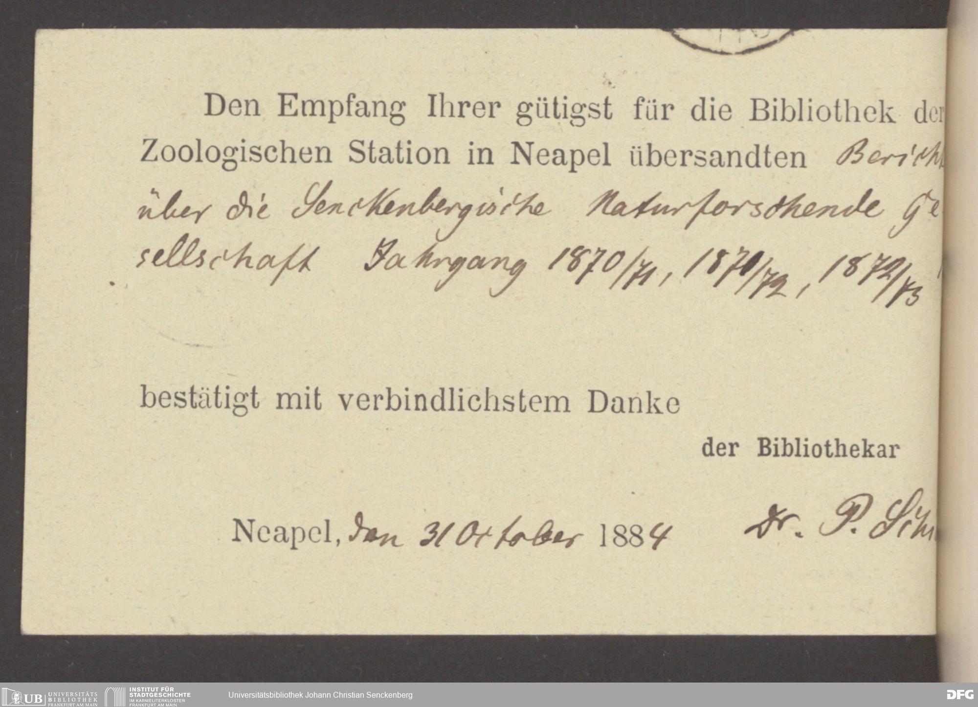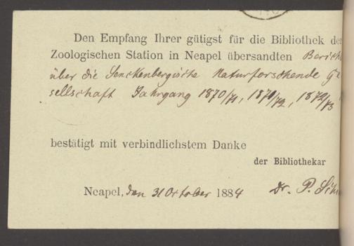 V176 Senckenberg Gesellschaft für Naturforschung, 17 - Korrespondenz über den Schriftentausch mit naturwissenschaftlichen Vereinigungen mit Ortsindex, Bd. 1