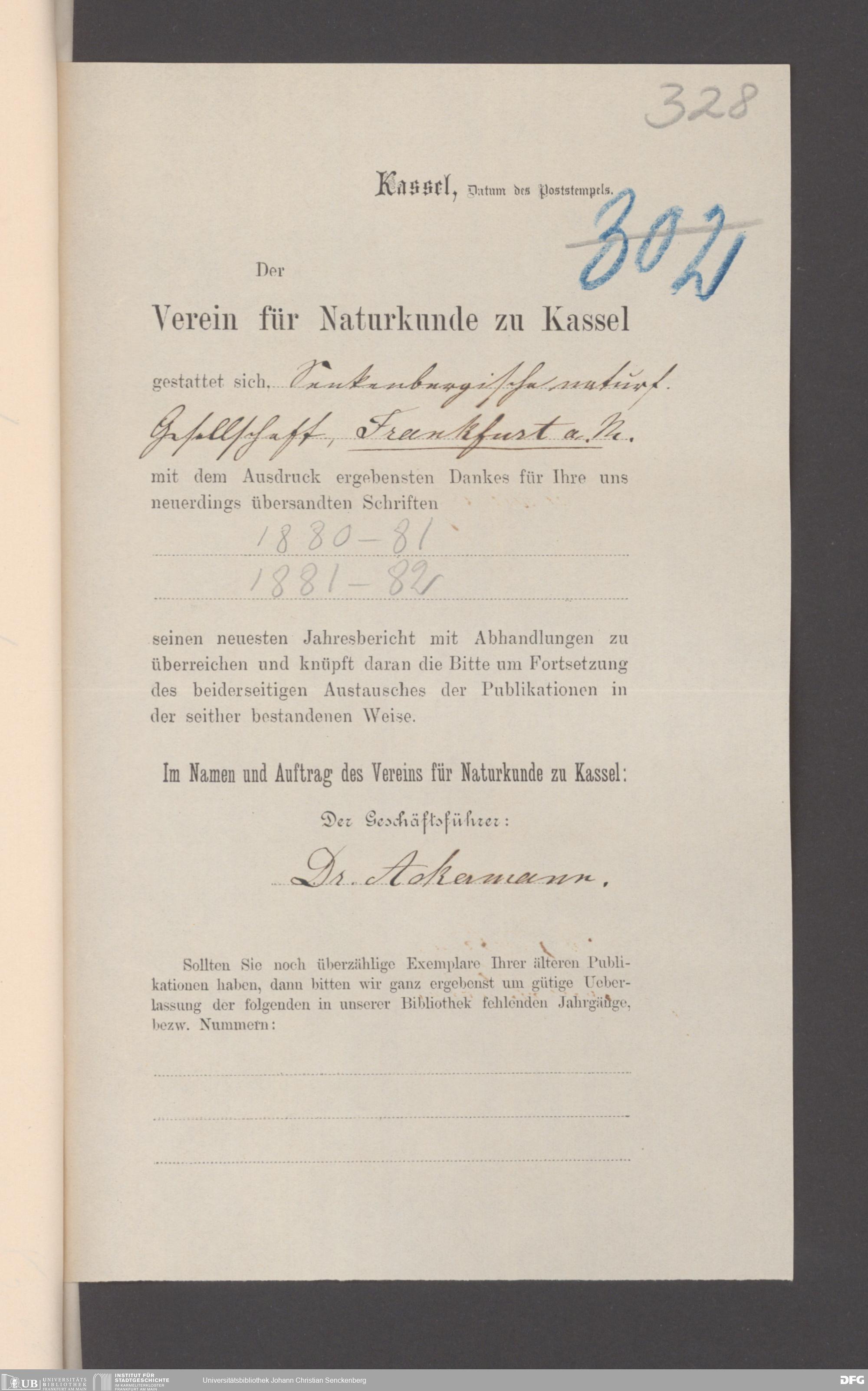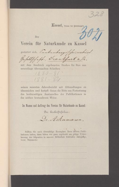 V176 Senckenberg Gesellschaft für Naturforschung, 17 - Korrespondenz über den Schriftentausch mit naturwissenschaftlichen Vereinigungen mit Ortsindex, Bd. 1