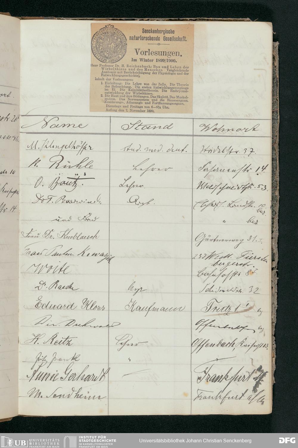 V176 Senckenberg Gesellschaft für Naturforschung, 56 - Teilnehmerlisten der Zoologievorlesungen, Bd. 1