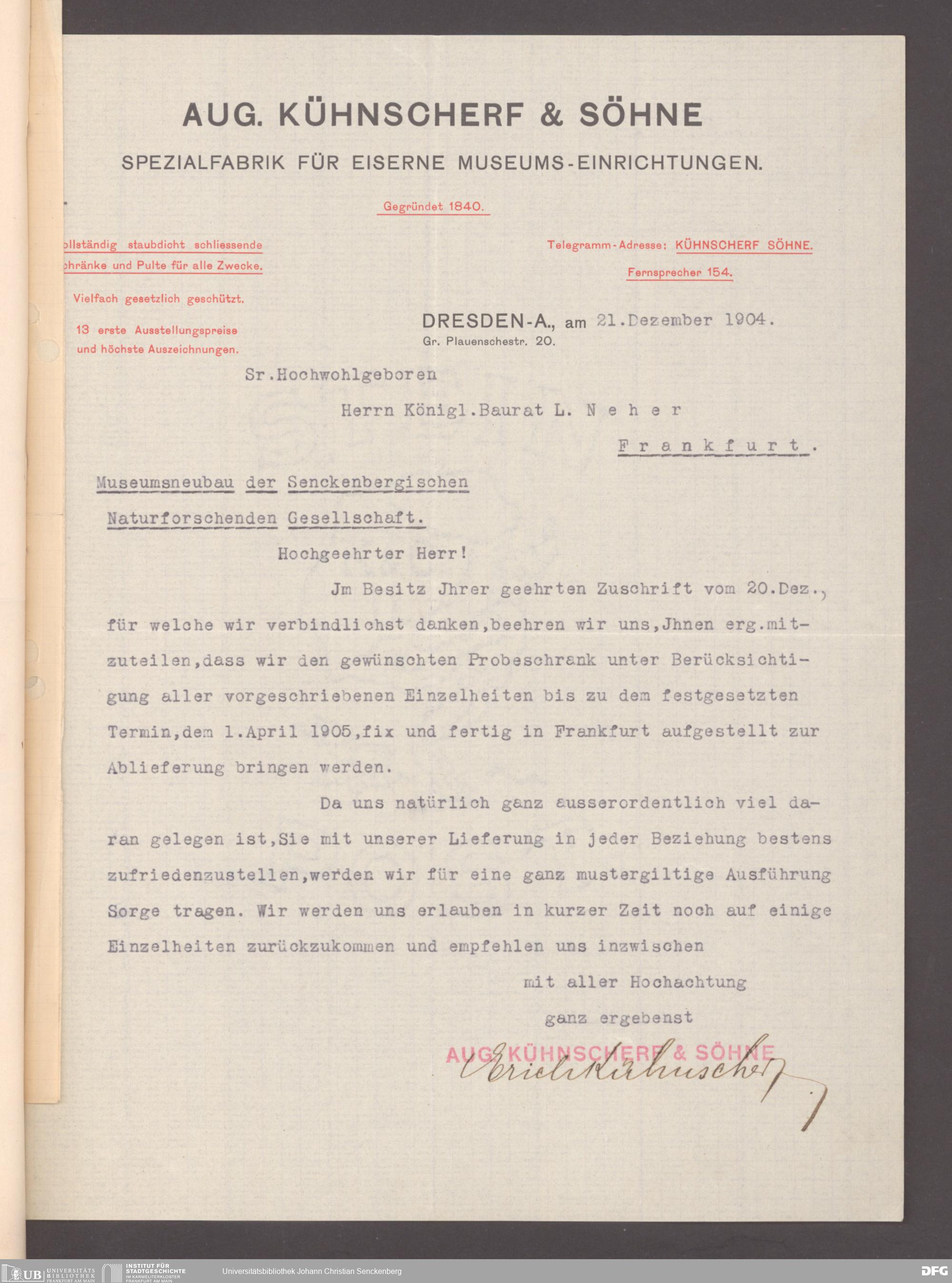 V176 Senckenberg Gesellschaft für Naturforschung, 152 - Ankauf von Museumsschränken bei der Firma August Kühnscherf und Söhne, Bd. 1