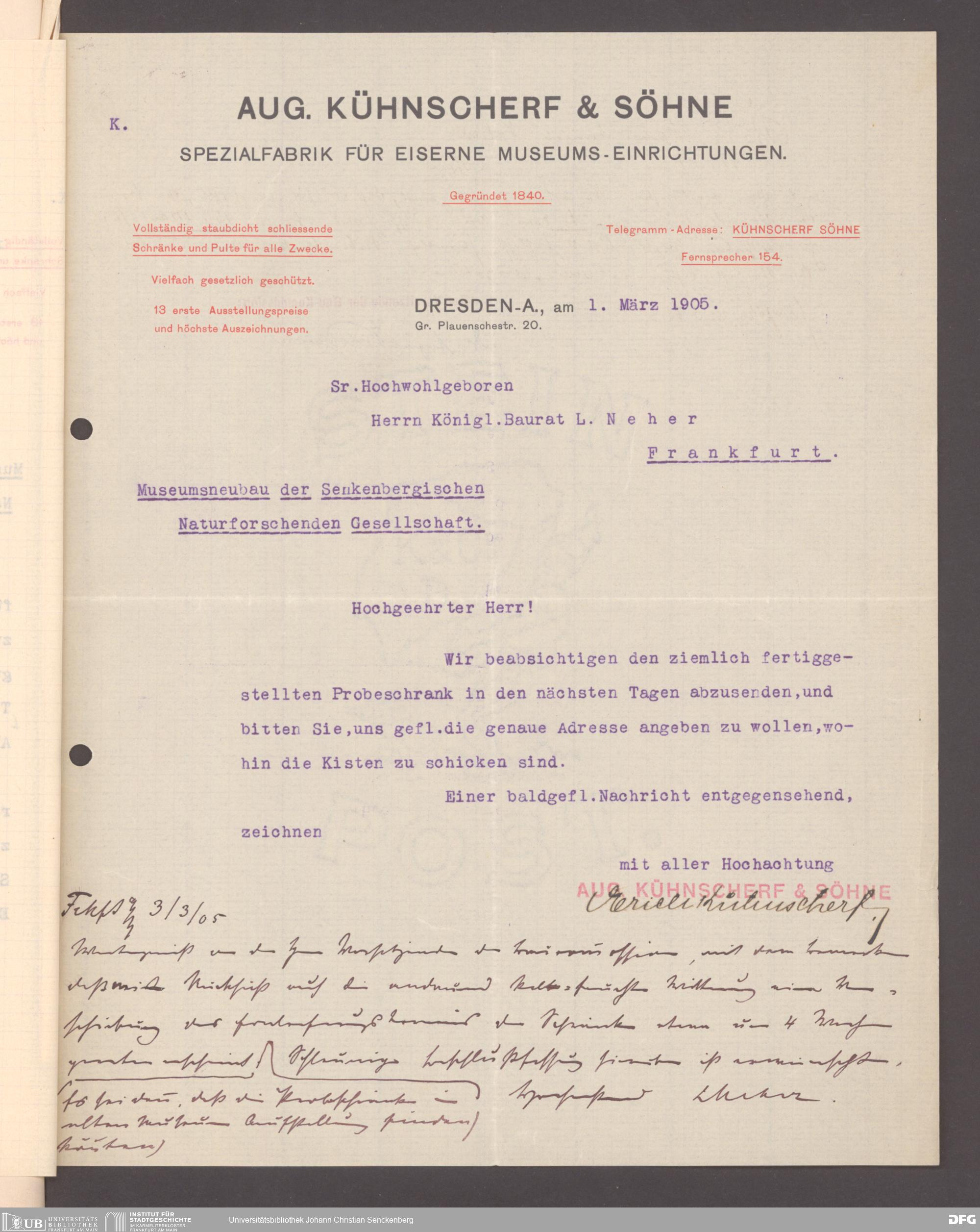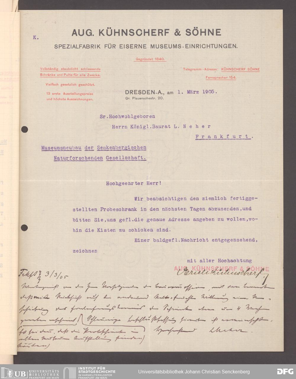 V176 Senckenberg Gesellschaft für Naturforschung, 152 - Ankauf von Museumsschränken bei der Firma August Kühnscherf und Söhne, Bd. 1