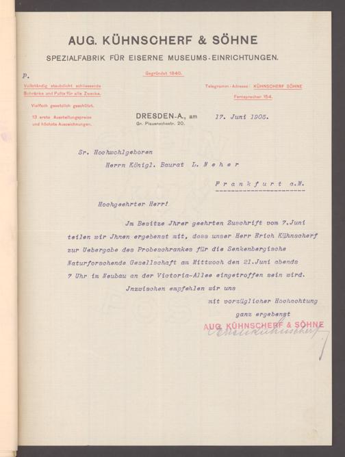 V176 Senckenberg Gesellschaft für Naturforschung, 152 - Ankauf von Museumsschränken bei der Firma August Kühnscherf und Söhne, Bd. 1