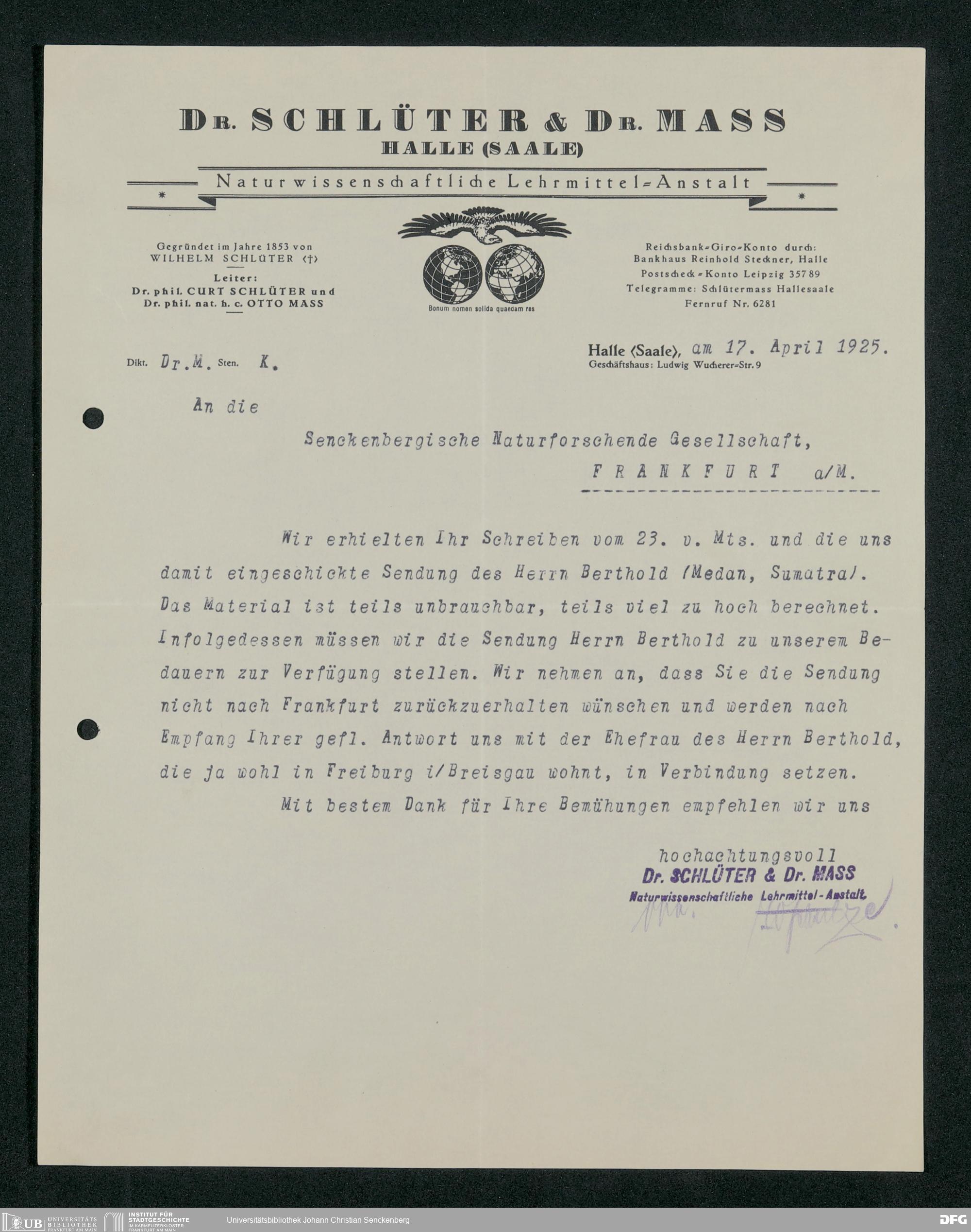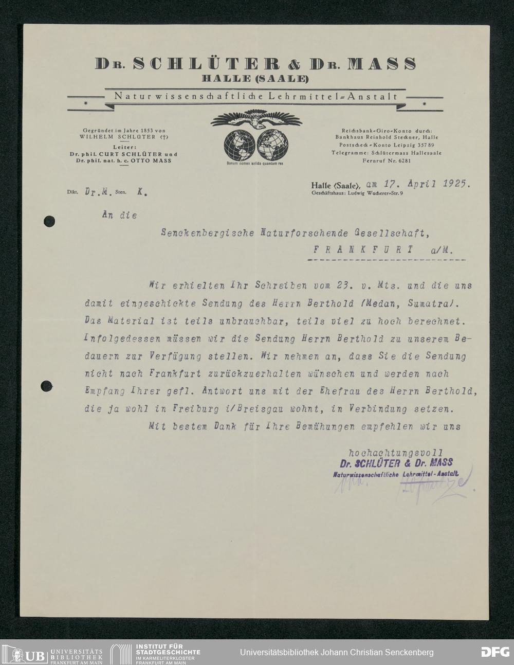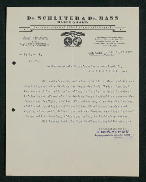 V176 Senckenberg Gesellschaft für Naturforschung, 160 - Geschäftsbeziehung mit der Naturwissenschaftlichen Lehrmittel-Anstalt Dr. Schlüter und Dr. Maß