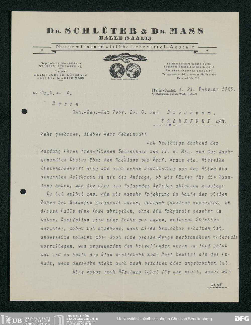 V176 Senckenberg Gesellschaft für Naturforschung, 160 - Geschäftsbeziehung mit der Naturwissenschaftlichen Lehrmittel-Anstalt Dr. Schlüter und Dr. Maß