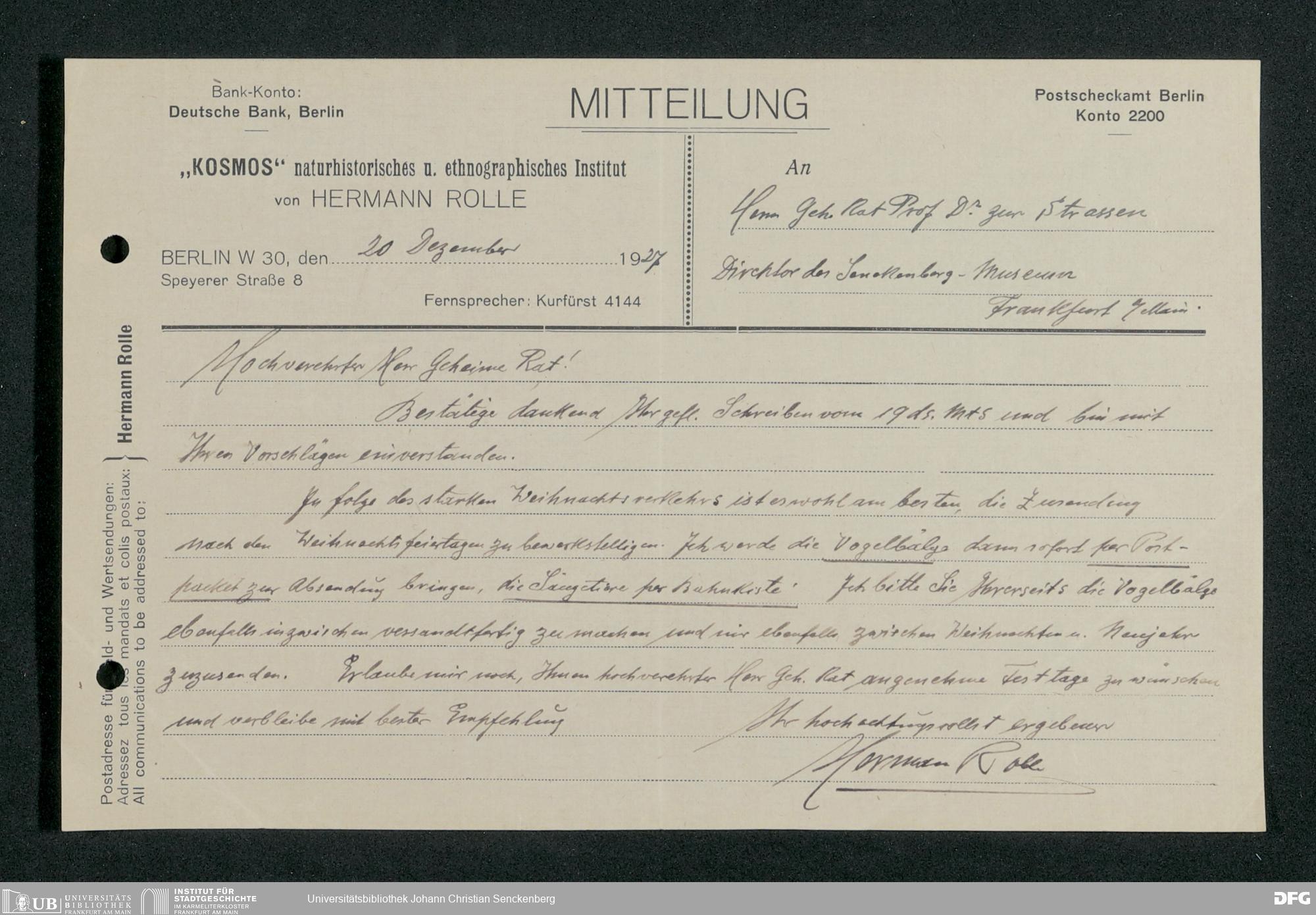 V176 Senckenberg Gesellschaft für Naturforschung, 210 - Erwerb zoologischer Exponate bei der Firma Kosmos Naturhistorisches und ethnographisches Institut Hermann Rolle