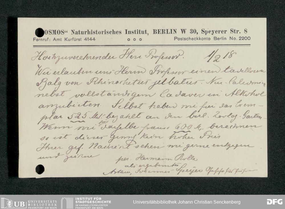 V176 Senckenberg Gesellschaft für Naturforschung, 210 - Erwerb zoologischer Exponate bei der Firma Kosmos Naturhistorisches und ethnographisches Institut Hermann Rolle