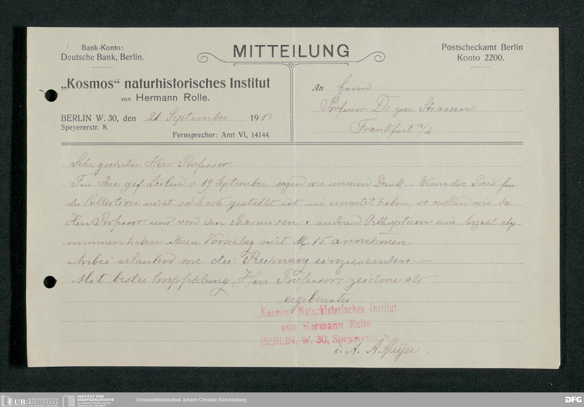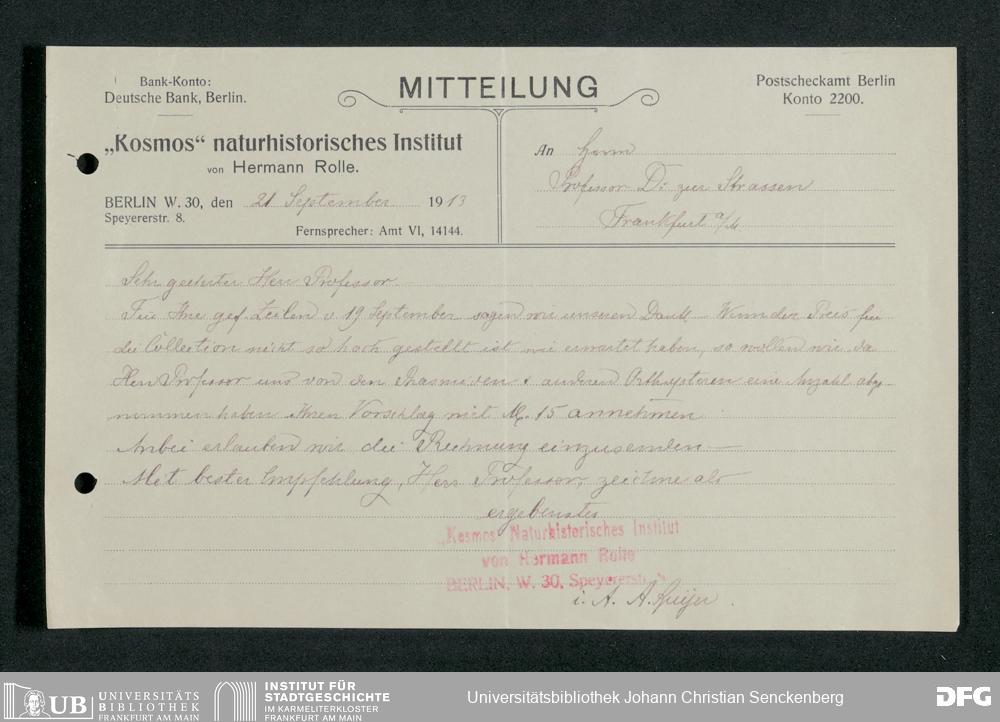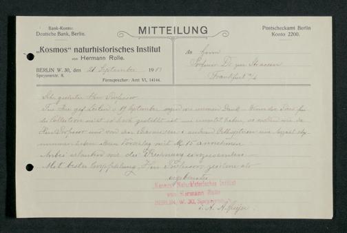 V176 Senckenberg Gesellschaft für Naturforschung, 210 - Erwerb zoologischer Exponate bei der Firma Kosmos Naturhistorisches und ethnographisches Institut Hermann Rolle