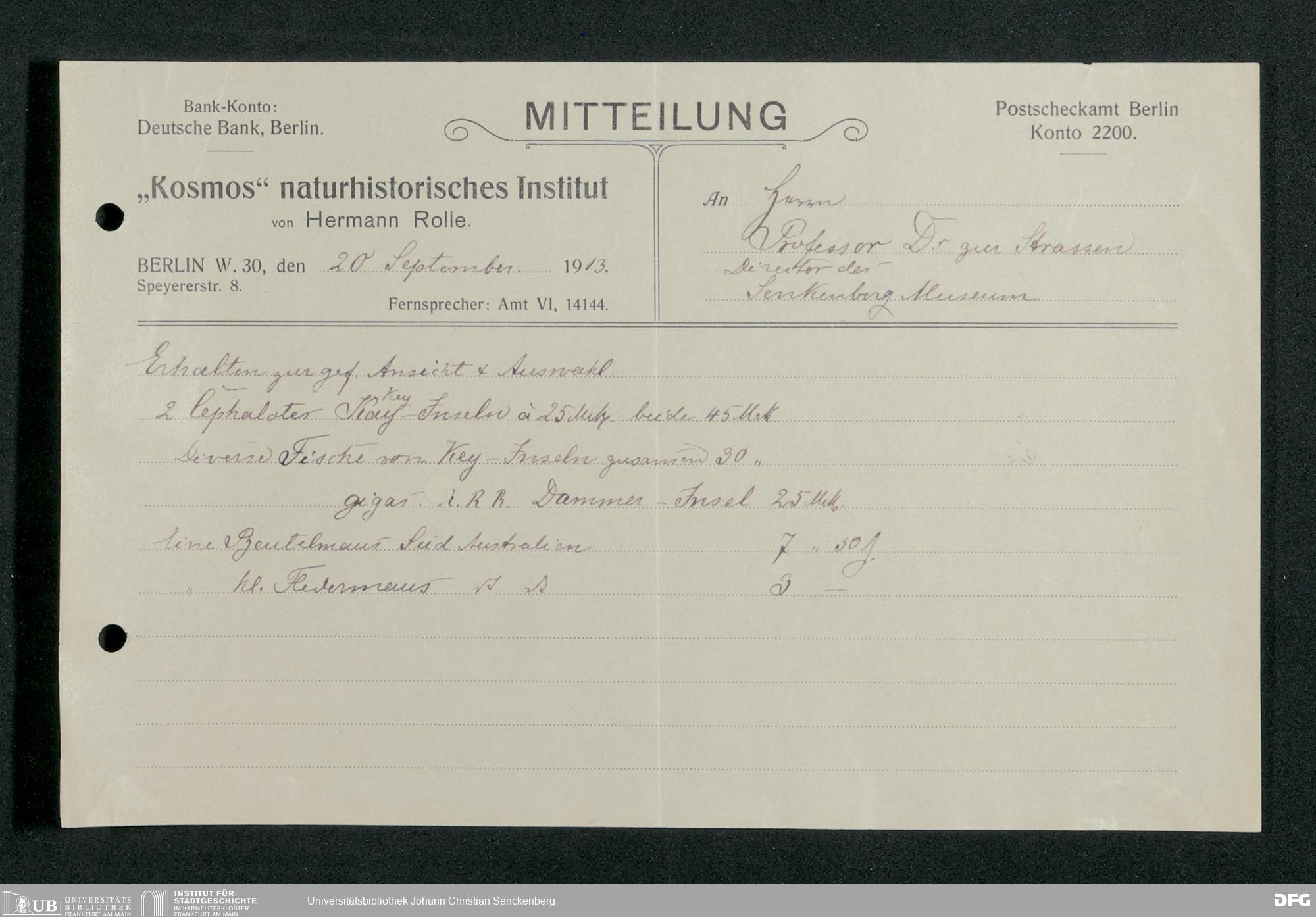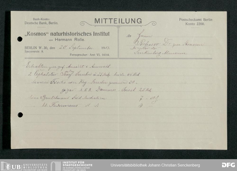V176 Senckenberg Gesellschaft für Naturforschung, 210 - Erwerb zoologischer Exponate bei der Firma Kosmos Naturhistorisches und ethnographisches Institut Hermann Rolle