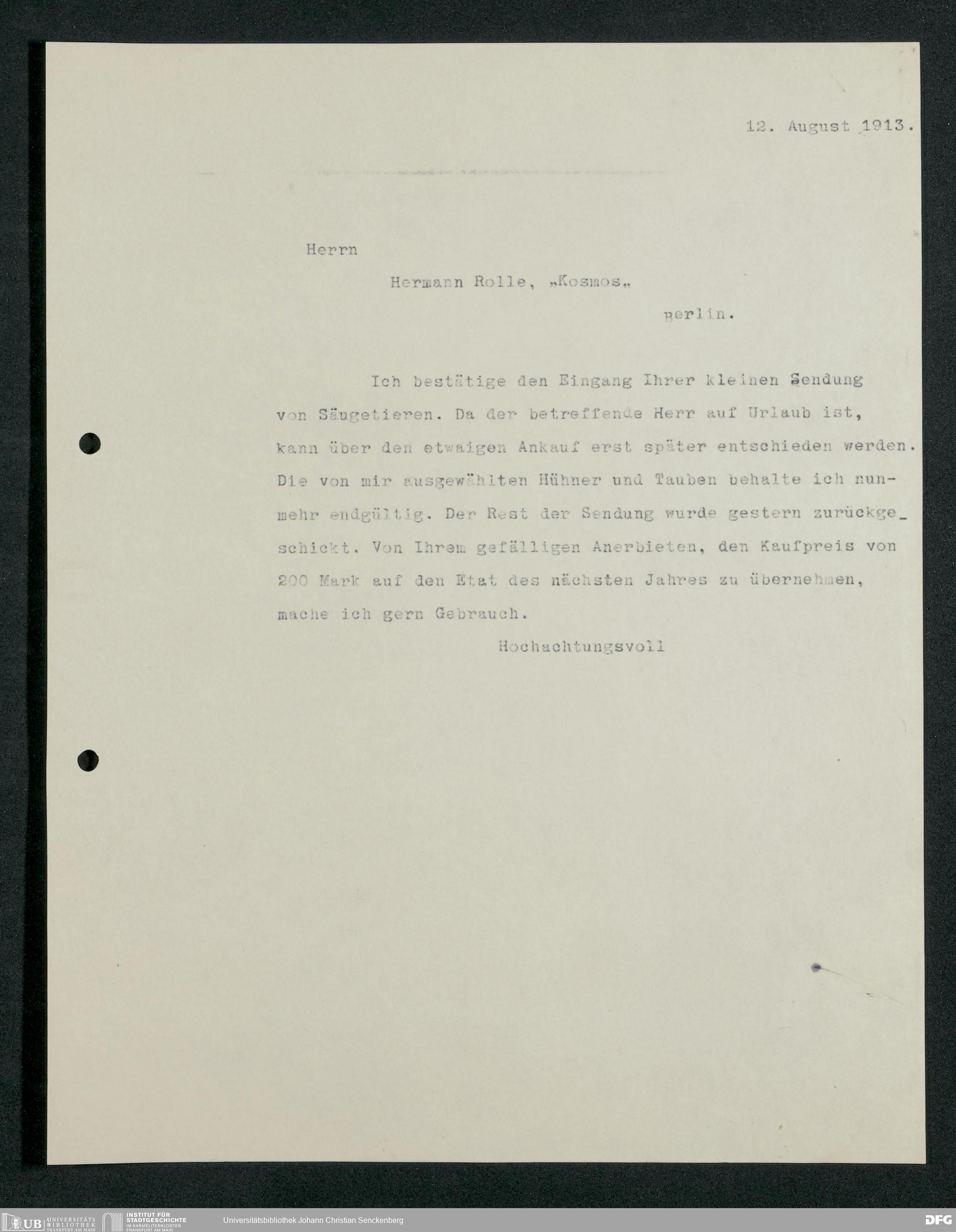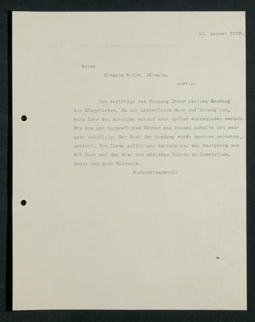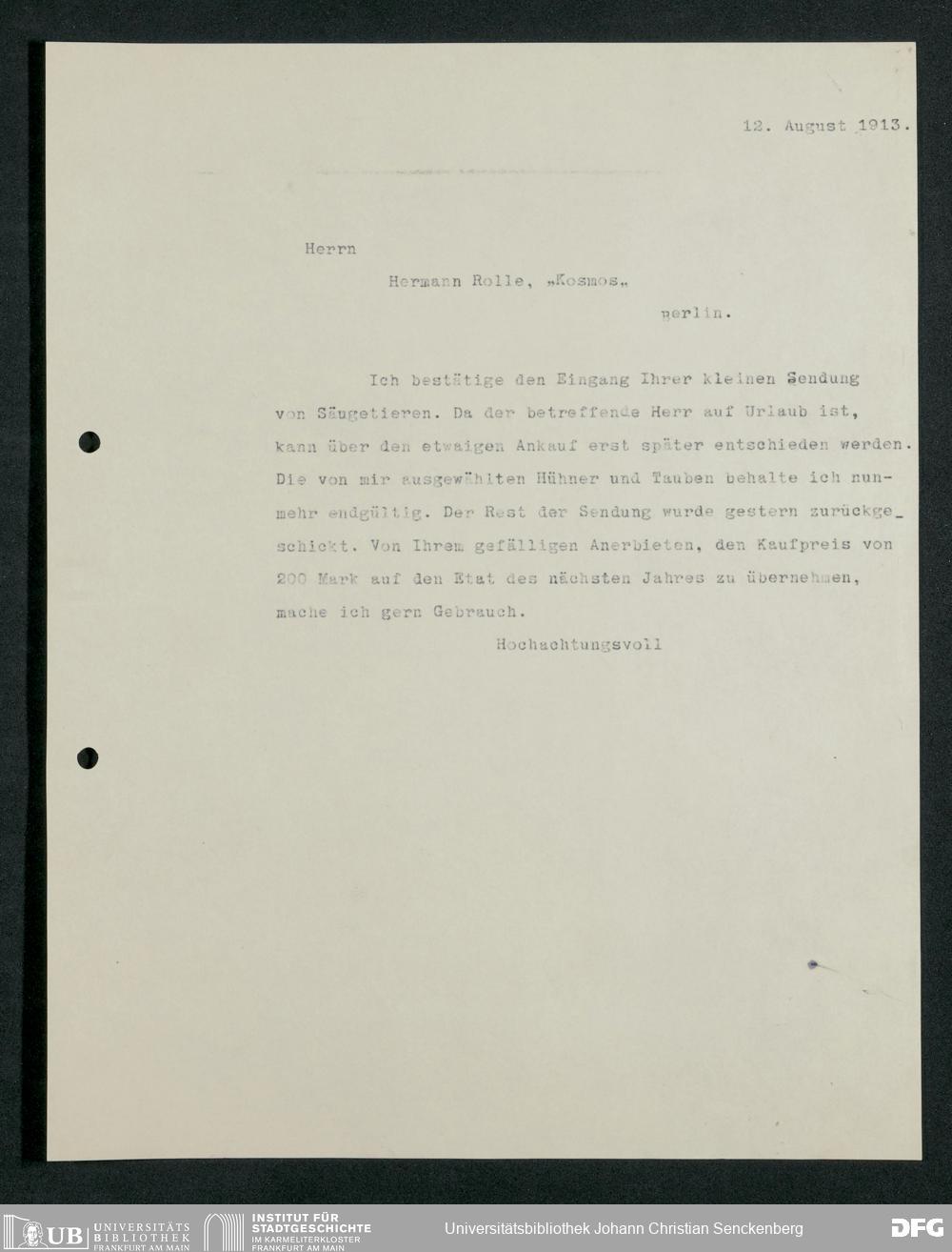 V176 Senckenberg Gesellschaft für Naturforschung, 210 - Erwerb zoologischer Exponate bei der Firma Kosmos Naturhistorisches und ethnographisches Institut Hermann Rolle
