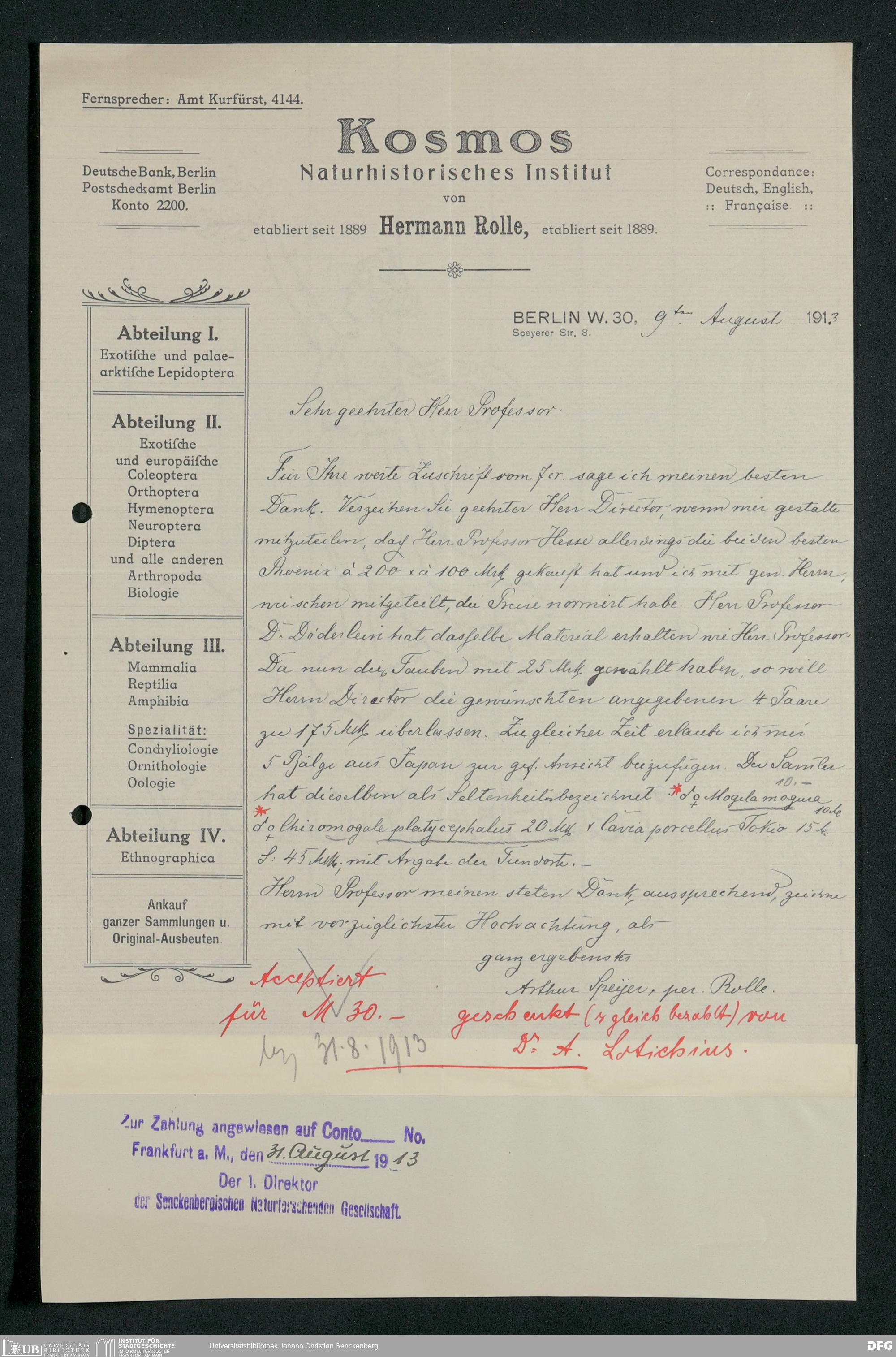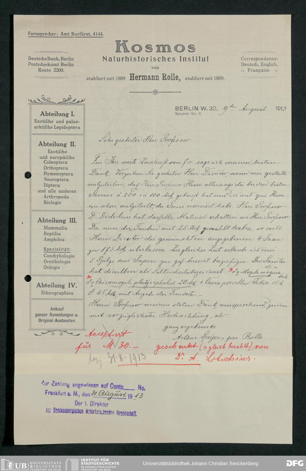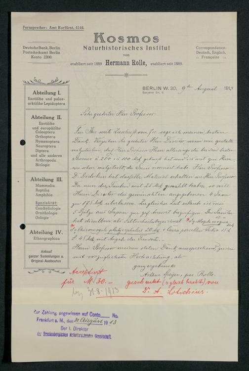 V176 Senckenberg Gesellschaft für Naturforschung, 210 - Erwerb zoologischer Exponate bei der Firma Kosmos Naturhistorisches und ethnographisches Institut Hermann Rolle